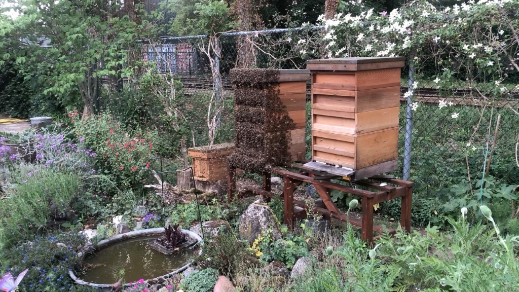 De zwerm hangt nu rustig op de tros aan de pergola, we kunnen er goed bij.