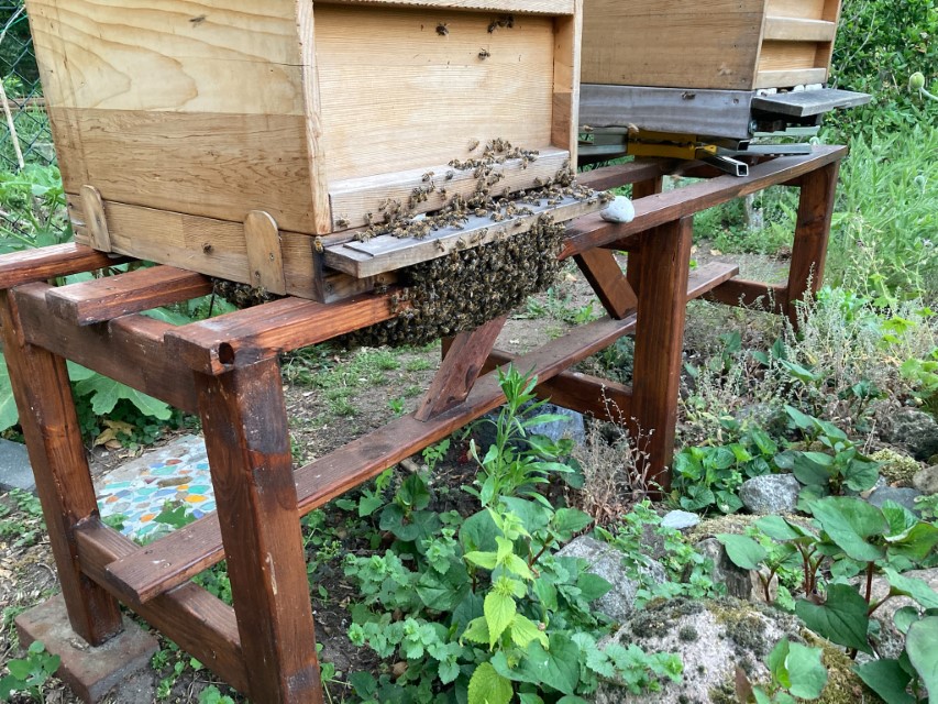 Een aantal dagen later kreeg ik bericht dat de bijen leken te zwermen, maar niet helemaal zoals de zwermen voorheen deden. Ze waren in ieder geval neergestreken op een favoriete plek in de leilindes. Ik vond dat zwermen maar onzin van ze, dus heb ze geschept en terug in de kast gestopt. Dat leek goed te zijn verlopen, de bijen zaten daarna te stertselen op de vliegplank en de rust leek teruggekeerd.