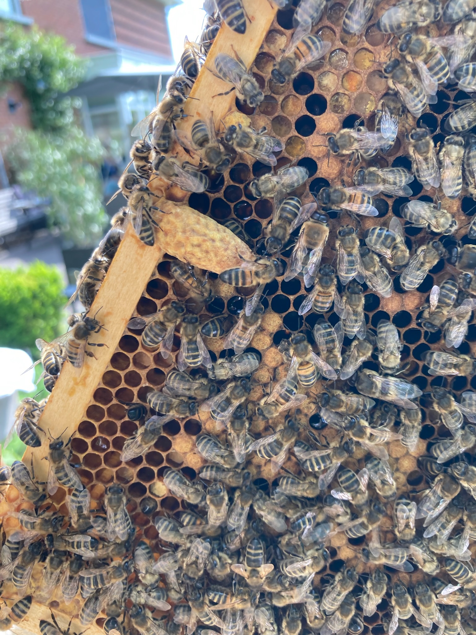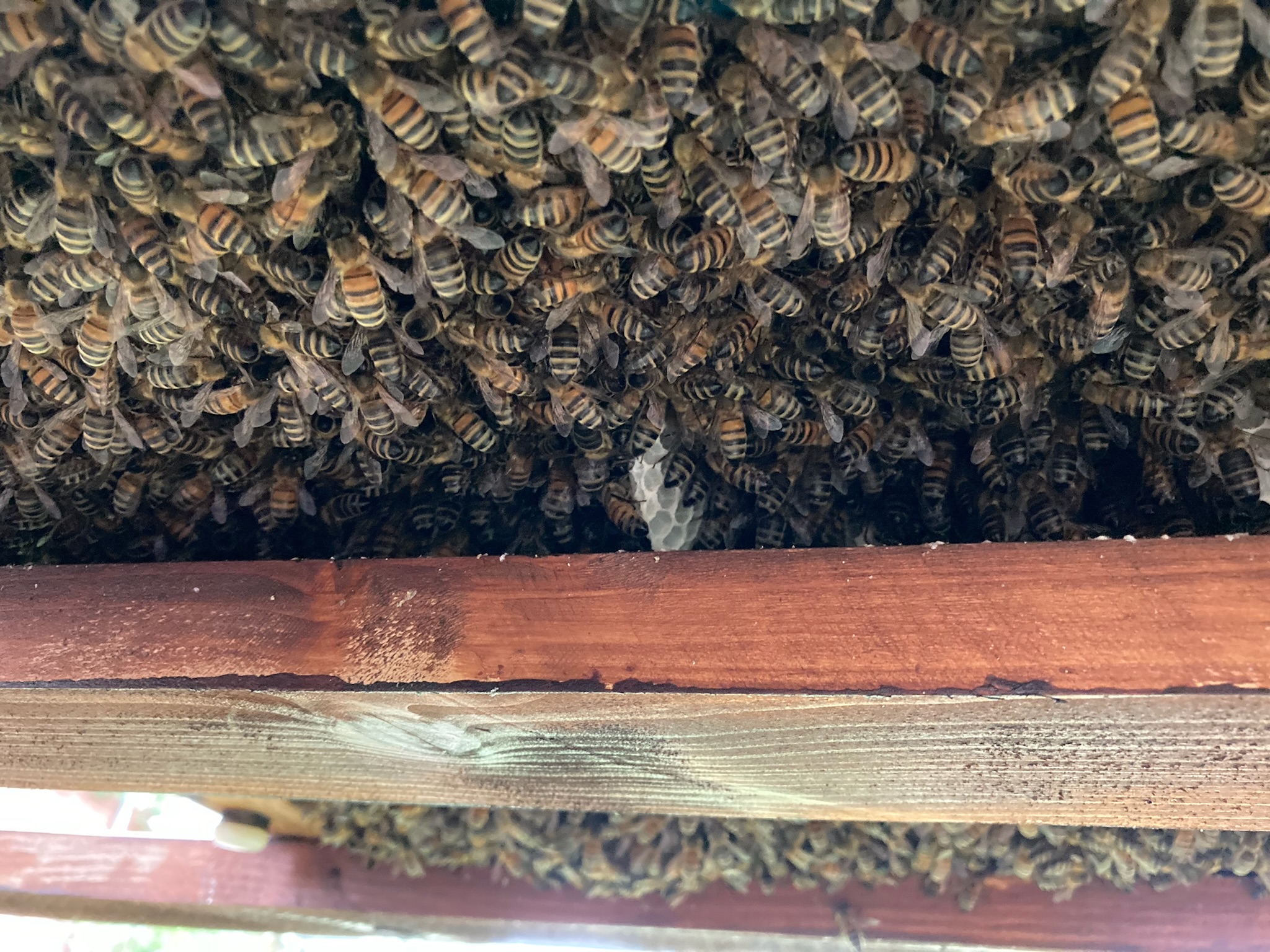 De volk van Koningin Evita was wat kaal aan het begin van de zomer, nadat Koningin Delphine en Koningin Elodie waren afgezwermd. Beide koninginnen hadden een deel van het volk mee, waardoor er niet heel veel bijen overbleven in de kast. Koningin Evita heeft dit echter goed ingehaald, half augustus is de kast mooi bezet en zijn er 6 ramen broed.