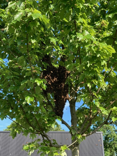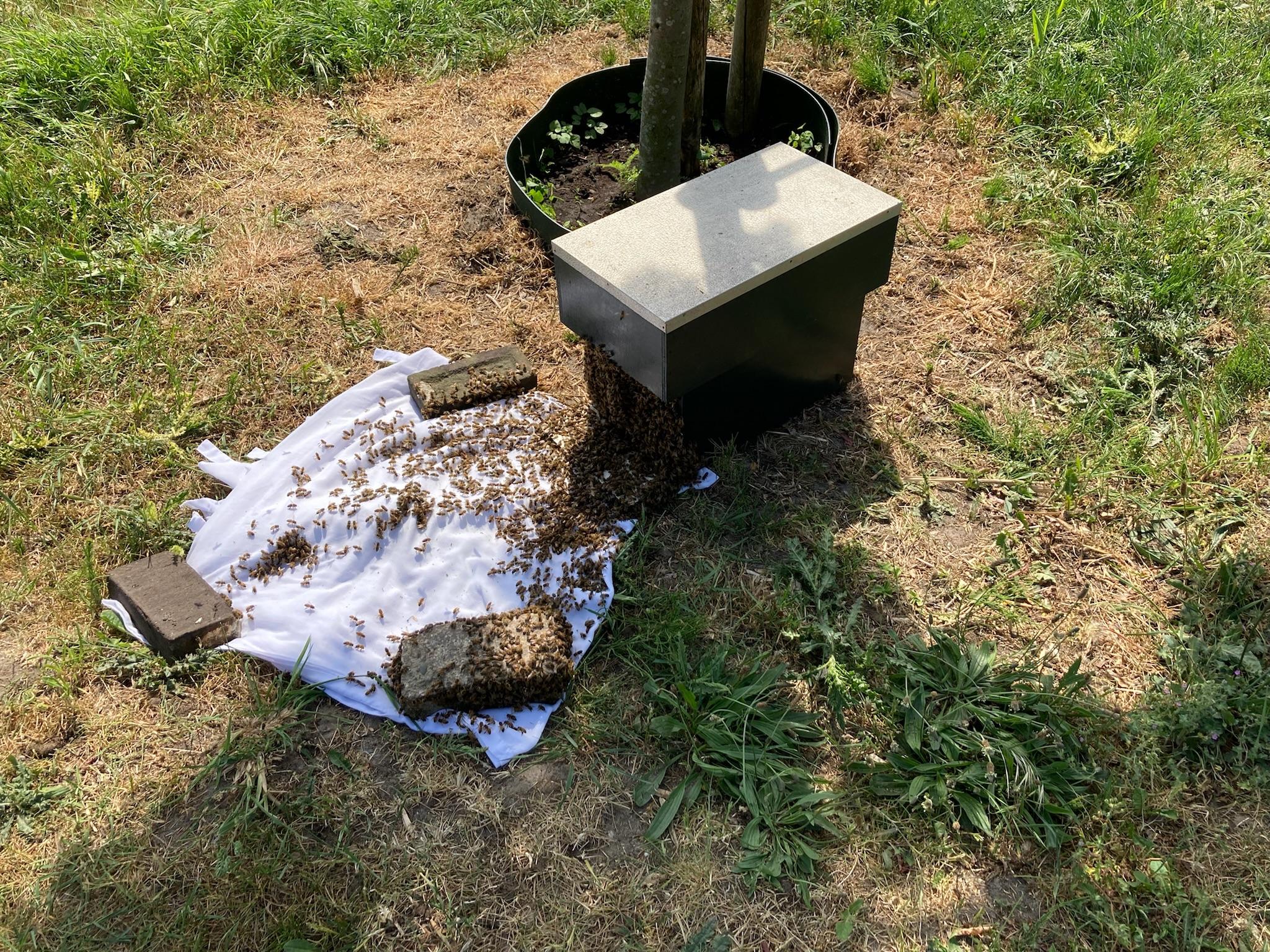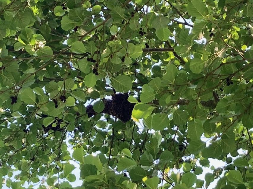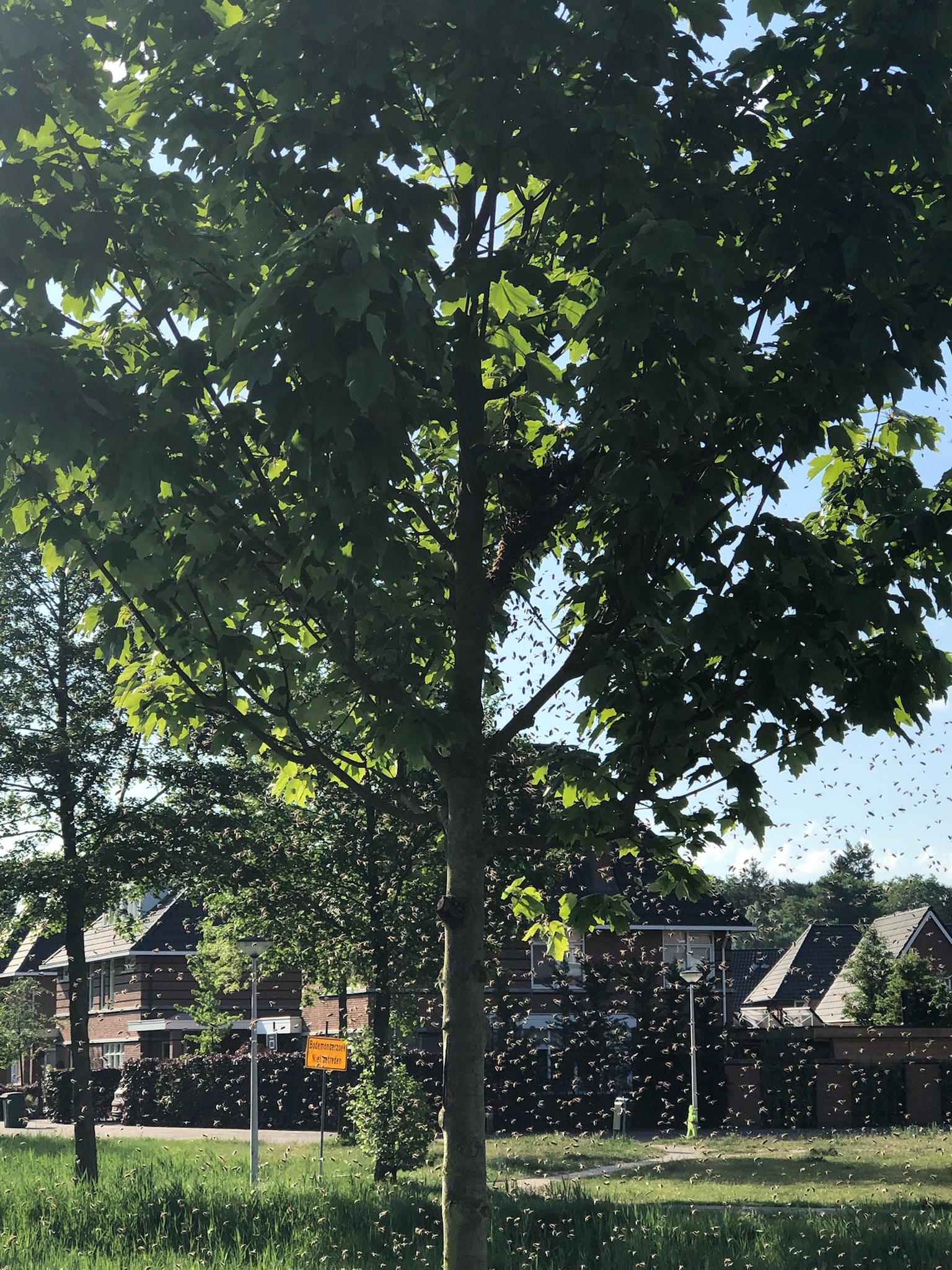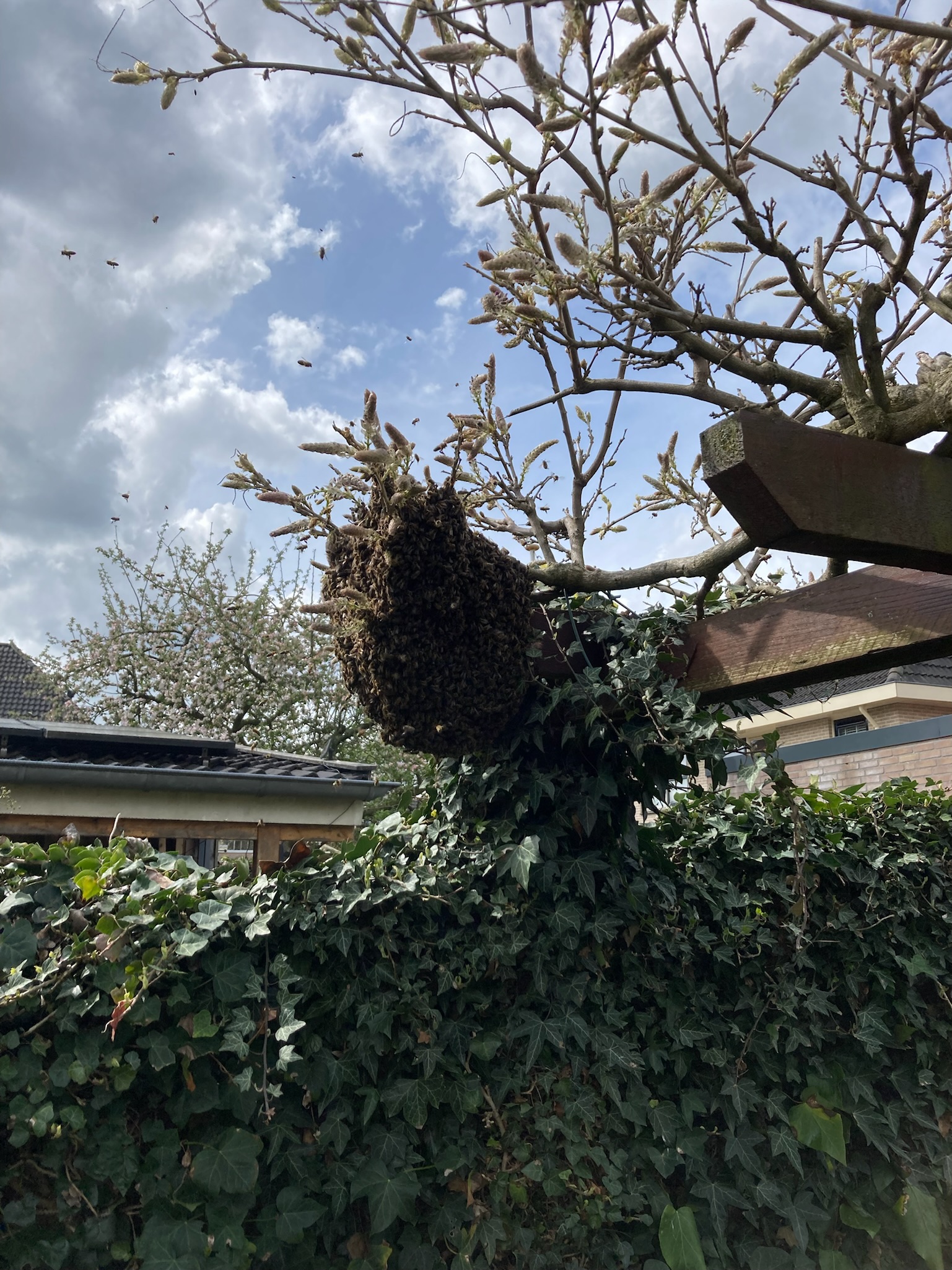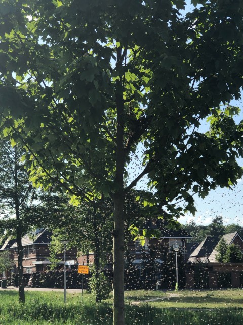 Al vroeg op de dag kreeg een een filmpje toegestuurd van een lucht vol bijen, en even later een foto van een tros in een boompje. Opnieuw een zwerm van een van de kasten, die gelukkig wel goed bereikbaar dicht bij de stand was neergestreken. Met behulp van een trap en een emmer had ik ze vrij vlot te pakken. Aangezien ik de zesramer nog bij de hand had, kon ik de emmer makkelijk leegstorten in het kastje en deze vlakbij neerzetten. Ik zag stromen bijen het kastje in lopen, dus dat zat goed: de koningin zat in de zesramer en de rest van het volk zou zich bij haar voegen. Ik liet de zesramer achter met de intentie de zwerm later op de dag weer bij de andere kasten te zetten.