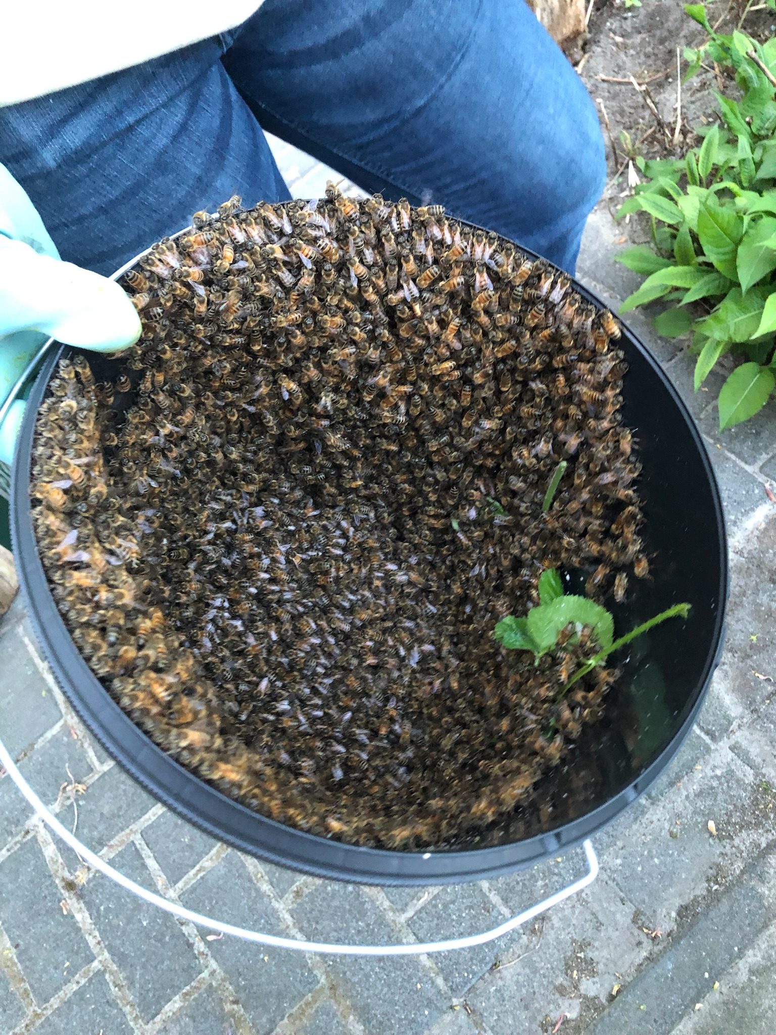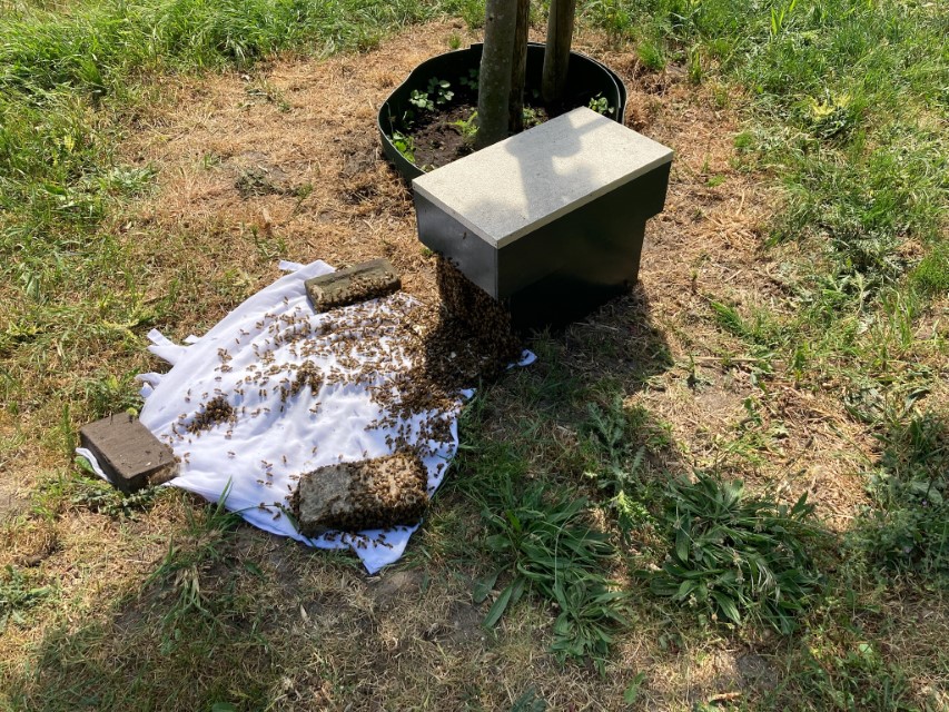 Gedurende de middag is de emmer kennelijk nog omgevallen, een eindje naar beneden richting de sloot, maar QC is blijven zitten en de zwerm is weer in de emmer gaan zitten. Dit maakte het oppakken en meenemen naar de bijenstand makkelijk. Ze in de 6-ramer krijgen was lastiger, aangezien ik geen extra kamer heb voor de 6-ramer. We hadden daarom van karton een soort trechter gemaakt. Helaas bleven ze erg op de zijkanten van de doos zitten ipv de kast in de gaan. In de hoop dat ze 's nachts zich zouden bedenken, hebben we de bovenkant gesloten en ze achtergelaten voor de nacht.
