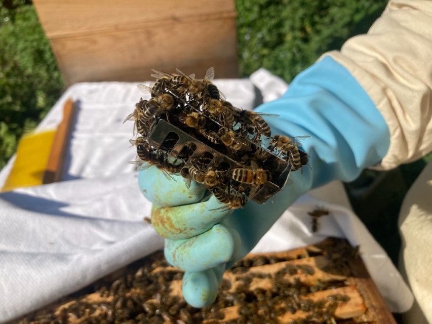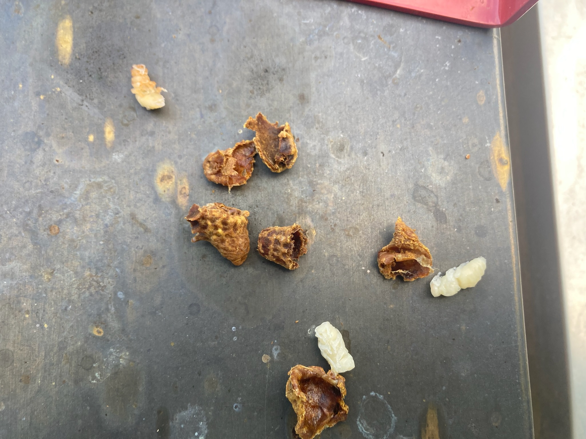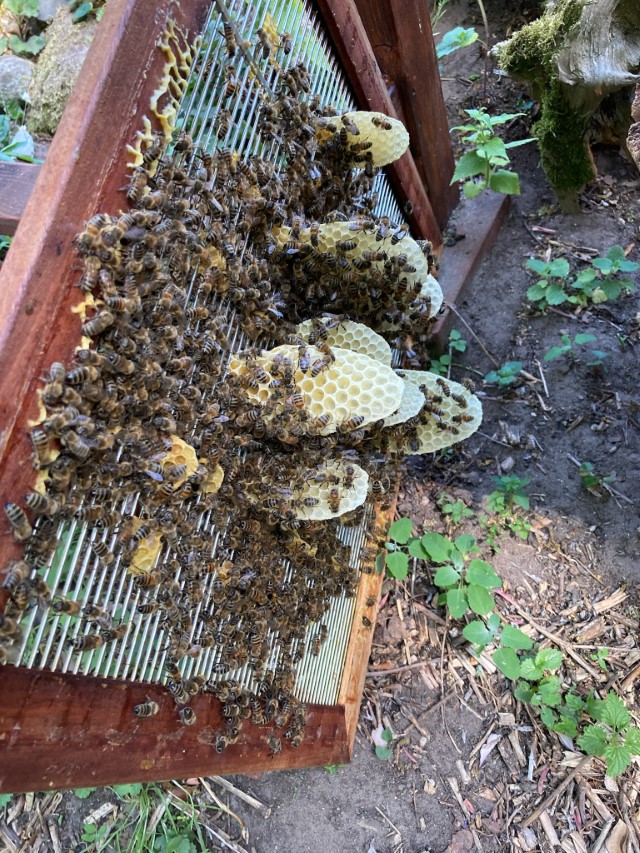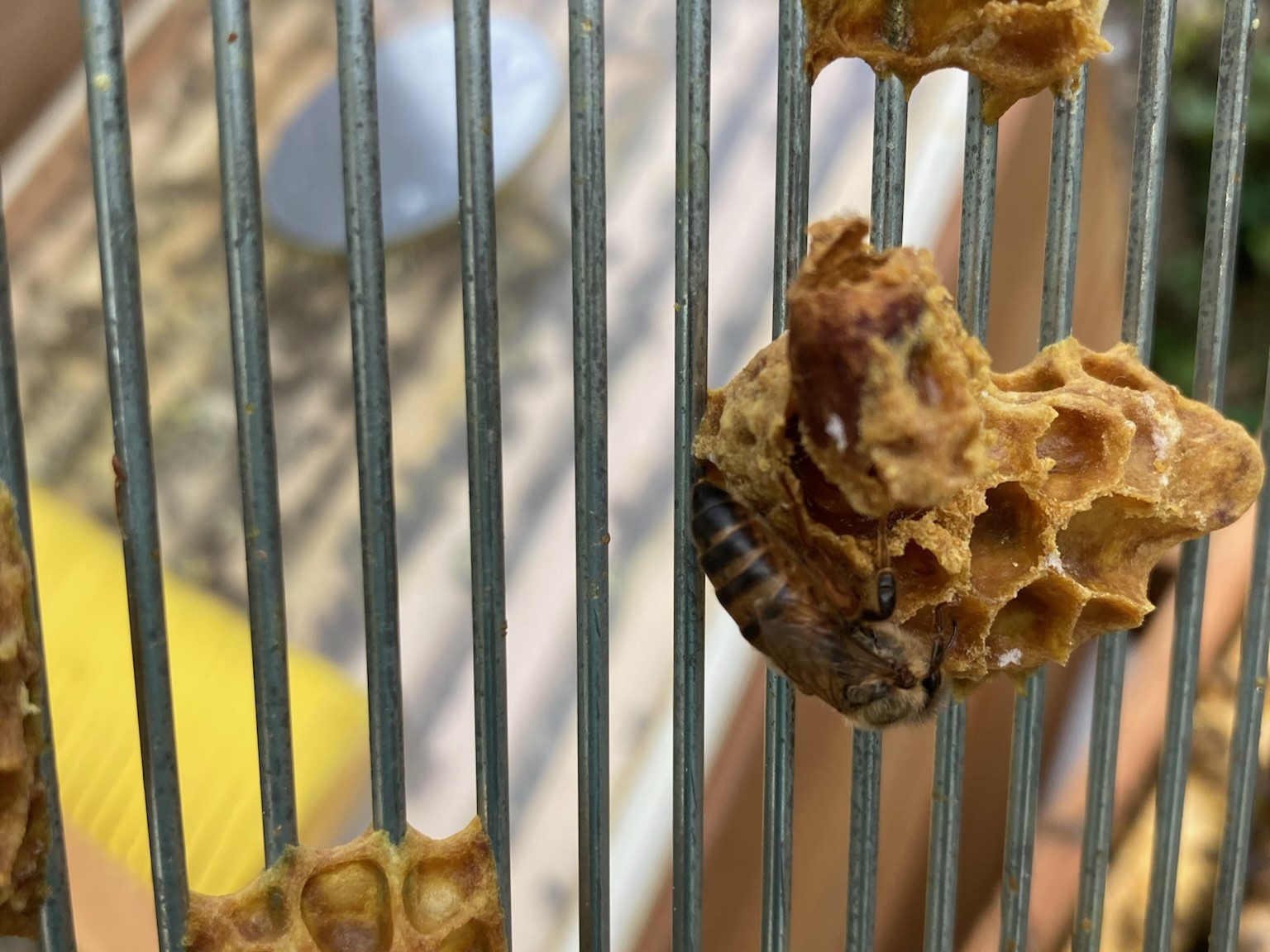 De uitgebroken doppen heb ik open gepulkt, maar een van de doppen was op dat moment aan het uitlopen! De uitgekomen nieuwe koningin heb ik gevangen en via de vliegspleet terug laten lopen in het volk. Hopelijk komt het goed!