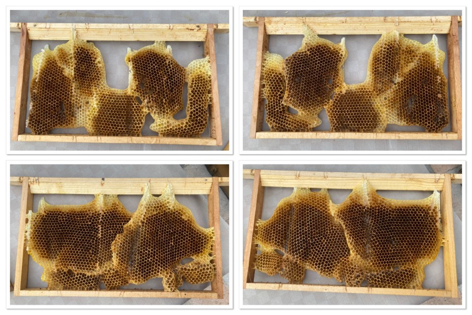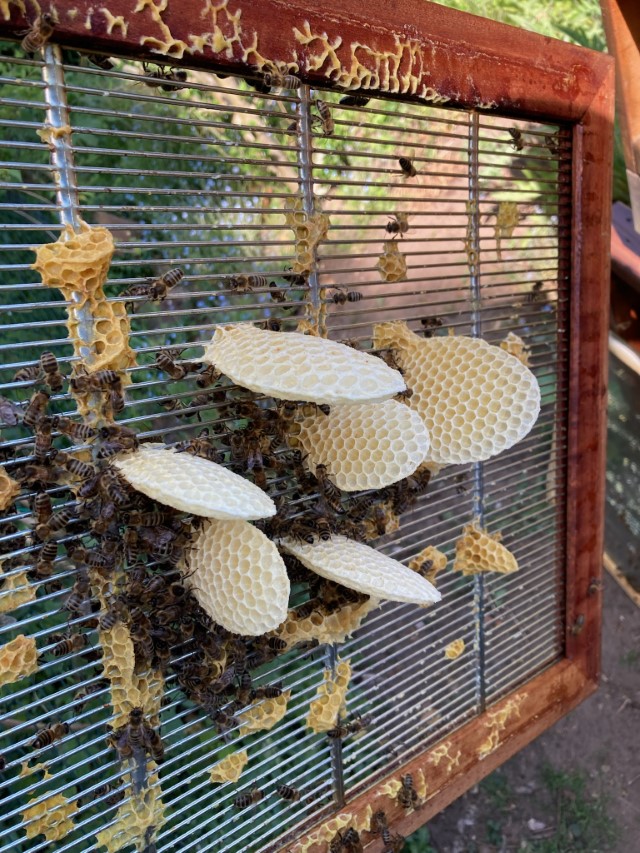 De ring heeft ongeveer anderhalve dag op de broedkamer gestaan voordat ik gelegenheid had om hem weer weg te halen. Heel naiëf dacht ik dat de bijen ondertussen rustig in de broedkamer of honingkamers waren gaan zitten. Dat was niet het geval, ze hadden goed gebruik gemaakt van de open ruimte!