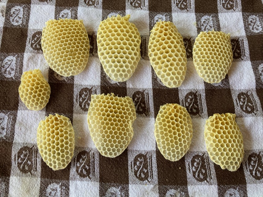 Deze moercel moet zoongeveer de laatste zijn die Bianca heeft belegd, aangezien koninginnen er 16 dagen over doen van ei tot bij. Daarbij heb ik haar ook nog over het hoofd gezien toen ik in het begin van de week de andere moercellen heb weggebroken en Delphine heb laten uitlopen.
