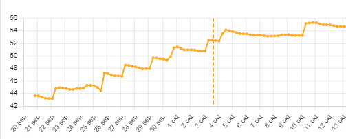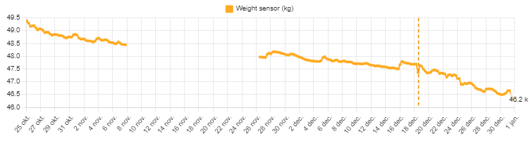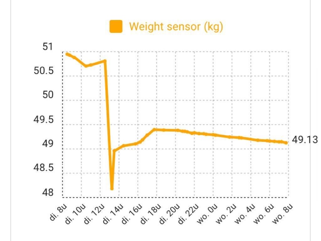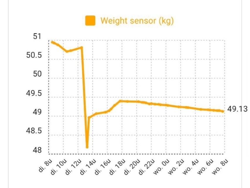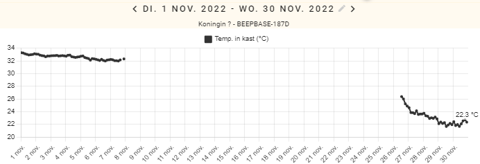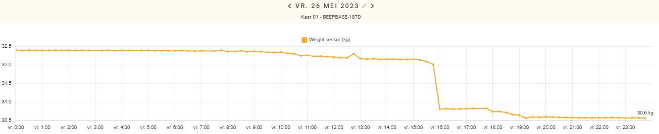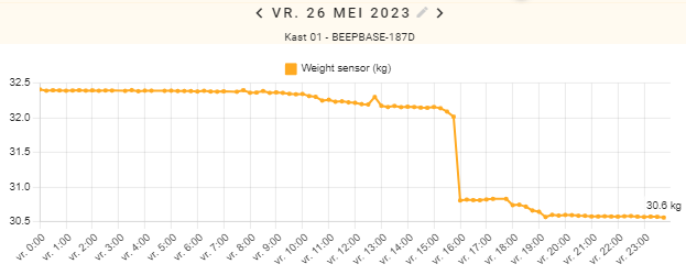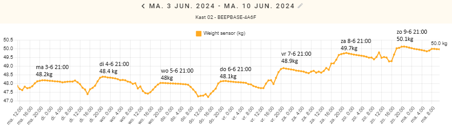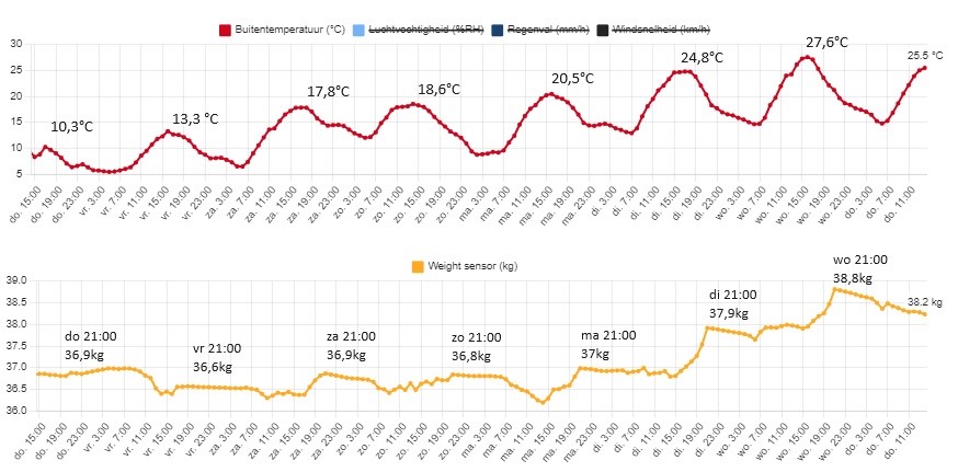 Deze kast heeft de base er onder staan, en het is in de data wel goed te zien dat de afgelopen 2 maanden flink in de eigen voorraad ingeteerd is… Dit zal een gevolg zijn van het kale volk: Weinig vliegbijen en dus weinig gelegenheid om nieuwe voorraad te halen. De beschikbare voorraad wordt gebruikt om de nieuwe aanwas te voeden.