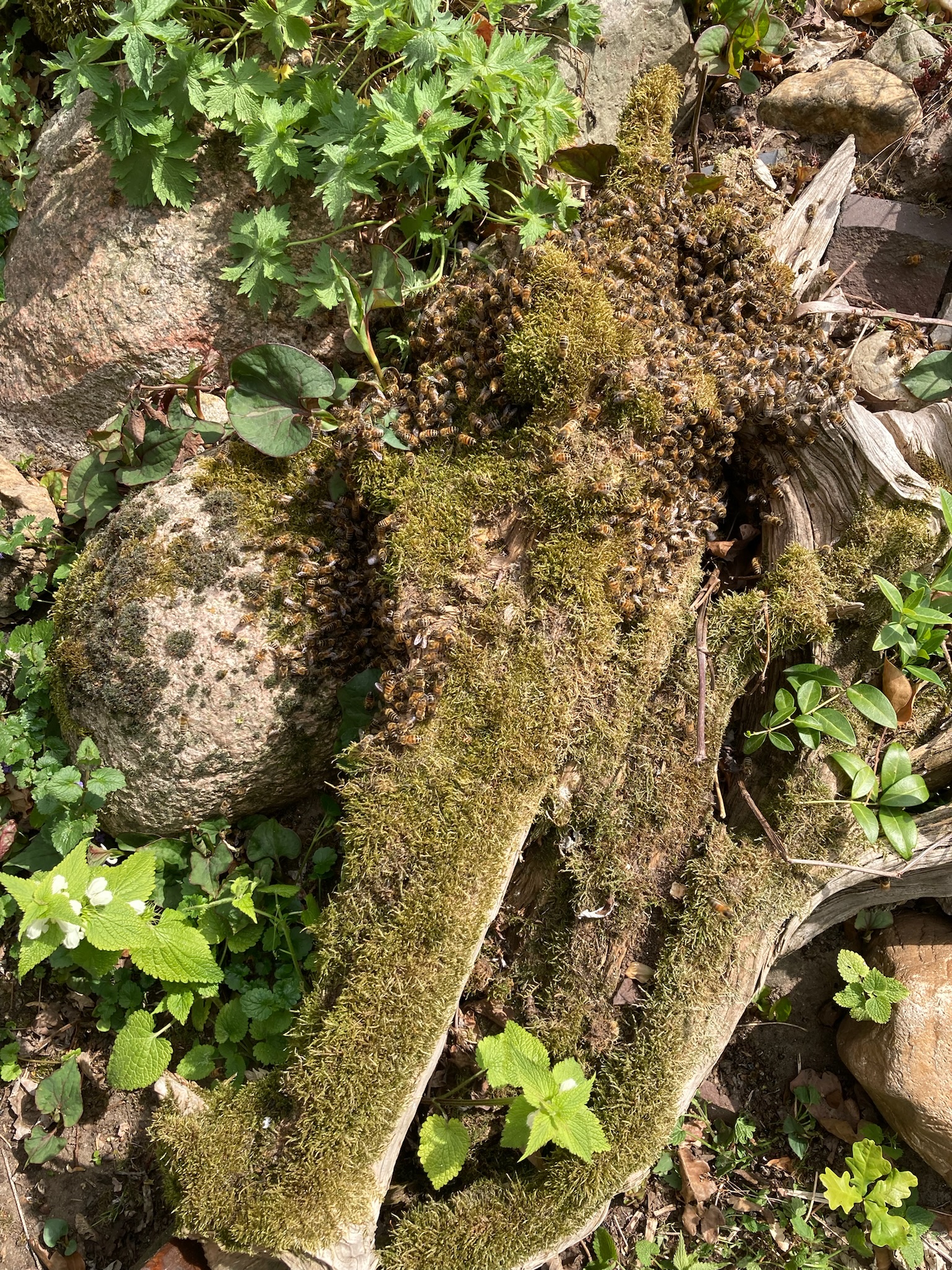 Op 4 mei de zwerm gevonden, deze lag schuin voor de kast op een boomstronk. Geprobeerd om deze met de hand in de 6-ramer te scheppen, maar dat lukte niet. De bijen zaten in alle kieren en gaten van de stronk. Uiteindelijk de stronk op de kop 'afgeslagen', hierbij (bleek) de Q ook in de bak terecht te komen. Helaas ook een hoop troep dus zo overgieten in de kast ging niet. QC zag ik ineens lopen, maar direct daarna wegvliegen: De rest van de bijen volgde snel.