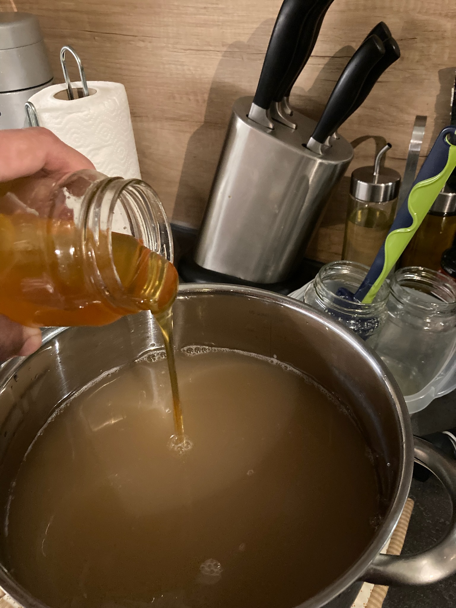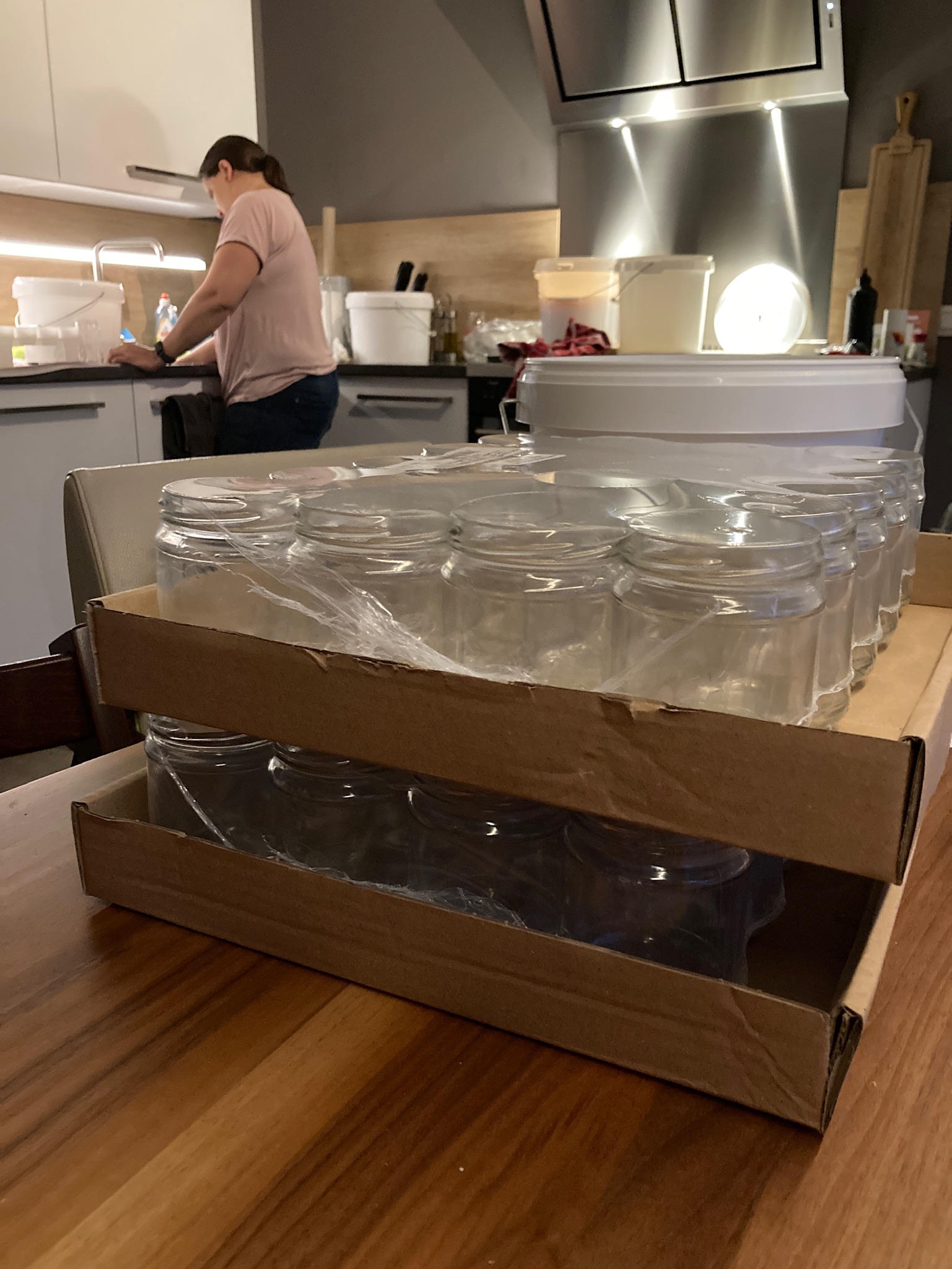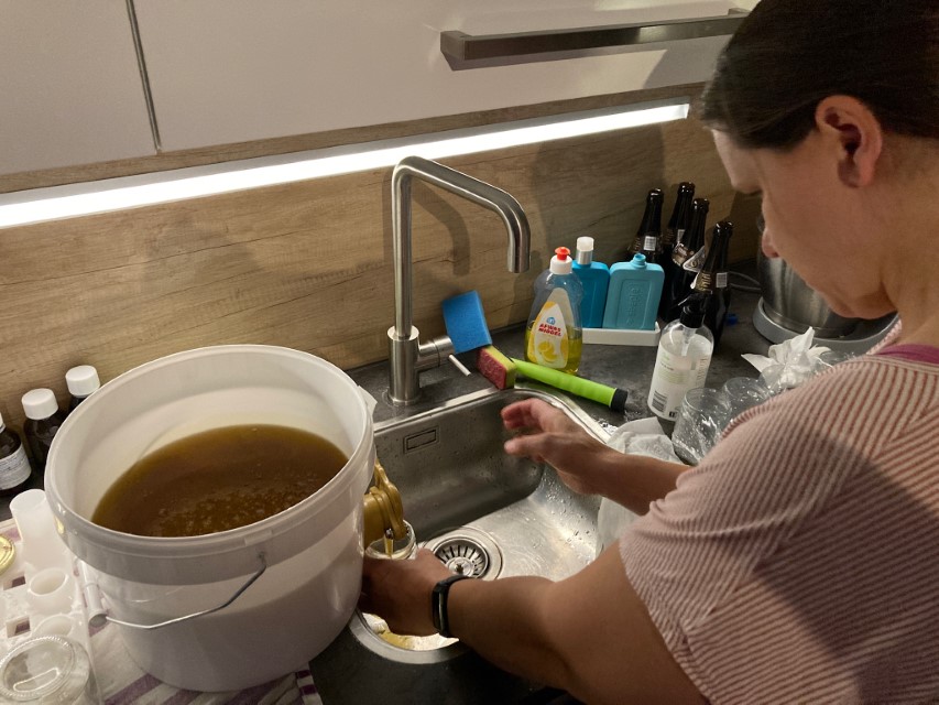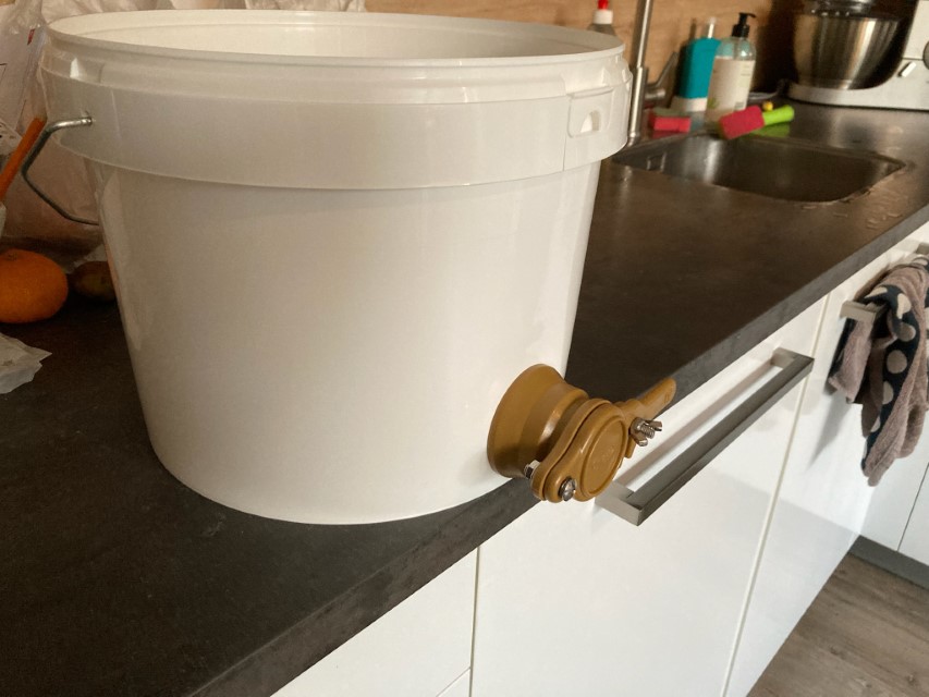 Eindelijk was daar de tijd om de honing die ik eerder had geoogst te bottelen. De snijkraan die al een tijd in de bak ligt hebben we eindelijk geinstalleerd in een voedselveilige emmer, en daarmee kan het bottelen beginnen! Samen met mijn man ging ik aan de slag met actieve zuurstof om de potjes en deksels schoon te maken.