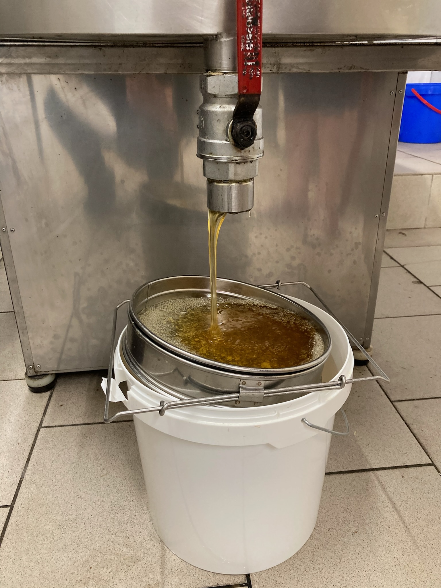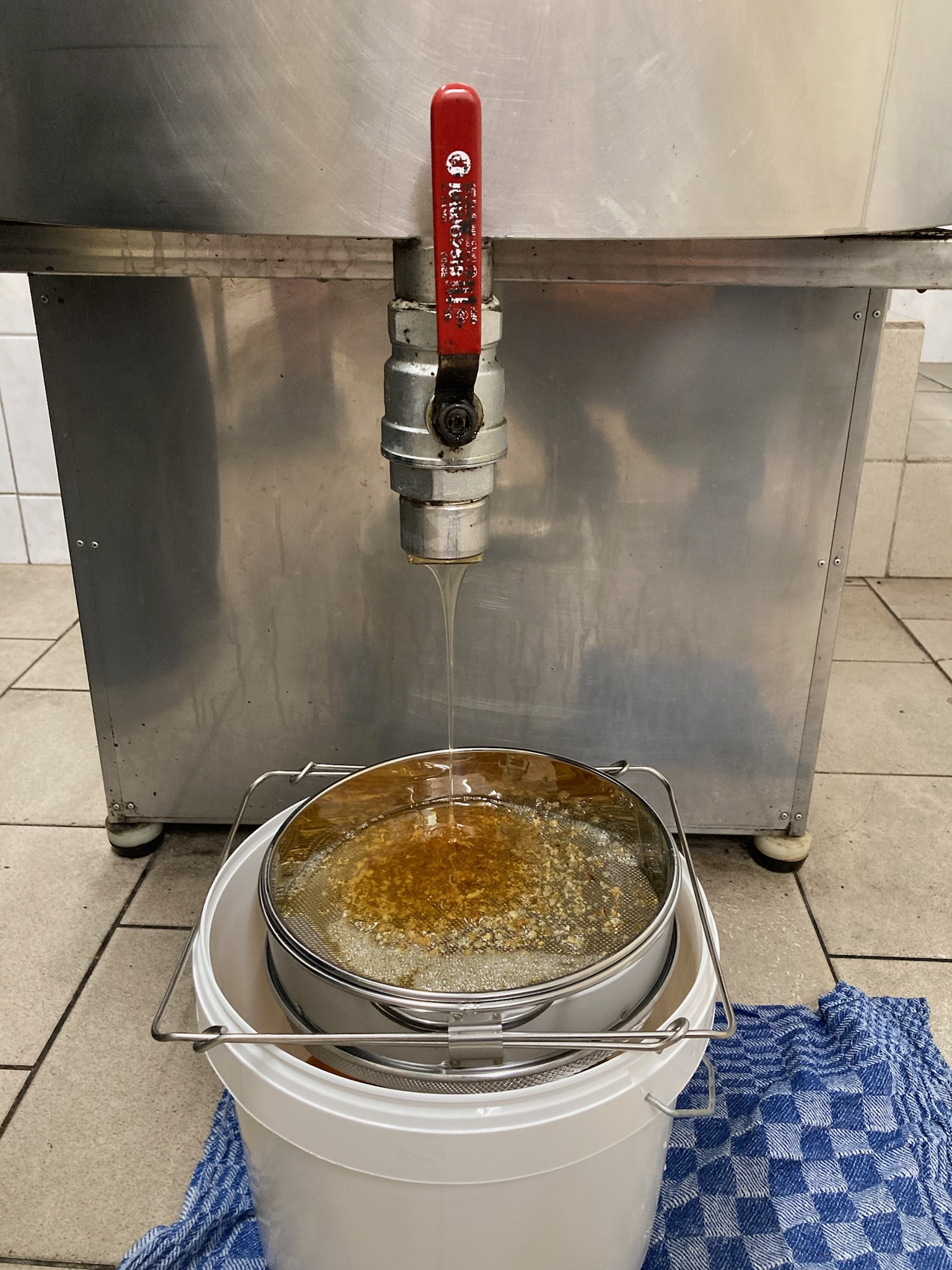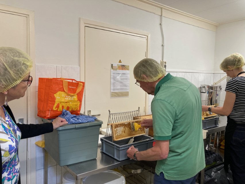 Ondertussen zijn er, naast de zwermende bijen, ook andere dingen die de imker bezighouden. Zo stonden er nog altijd emmers met honing van de vorige zomer in de kast. 'Kom', zei het hulpteam, 'we gaan er deze week mee aan de slag.'