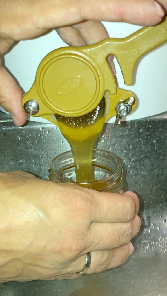 Ontzegelen, uitvinden hoe de slinger ook al weer werkt, het kost toch allemaal meer tijd dan ik dacht, en zo zijn vandaag slechts 2 van de 4 honingkamers geslingerd. Deze hebben wel een prachtige oogst van +/- 14 liter honing opgeleverd! De emmers met honing staan nu in de schuur, wachtend op de dag dat de nieuwe potjes zijn gearriveerd en het bottelen kan beginnen.
