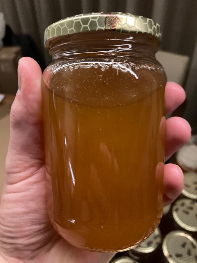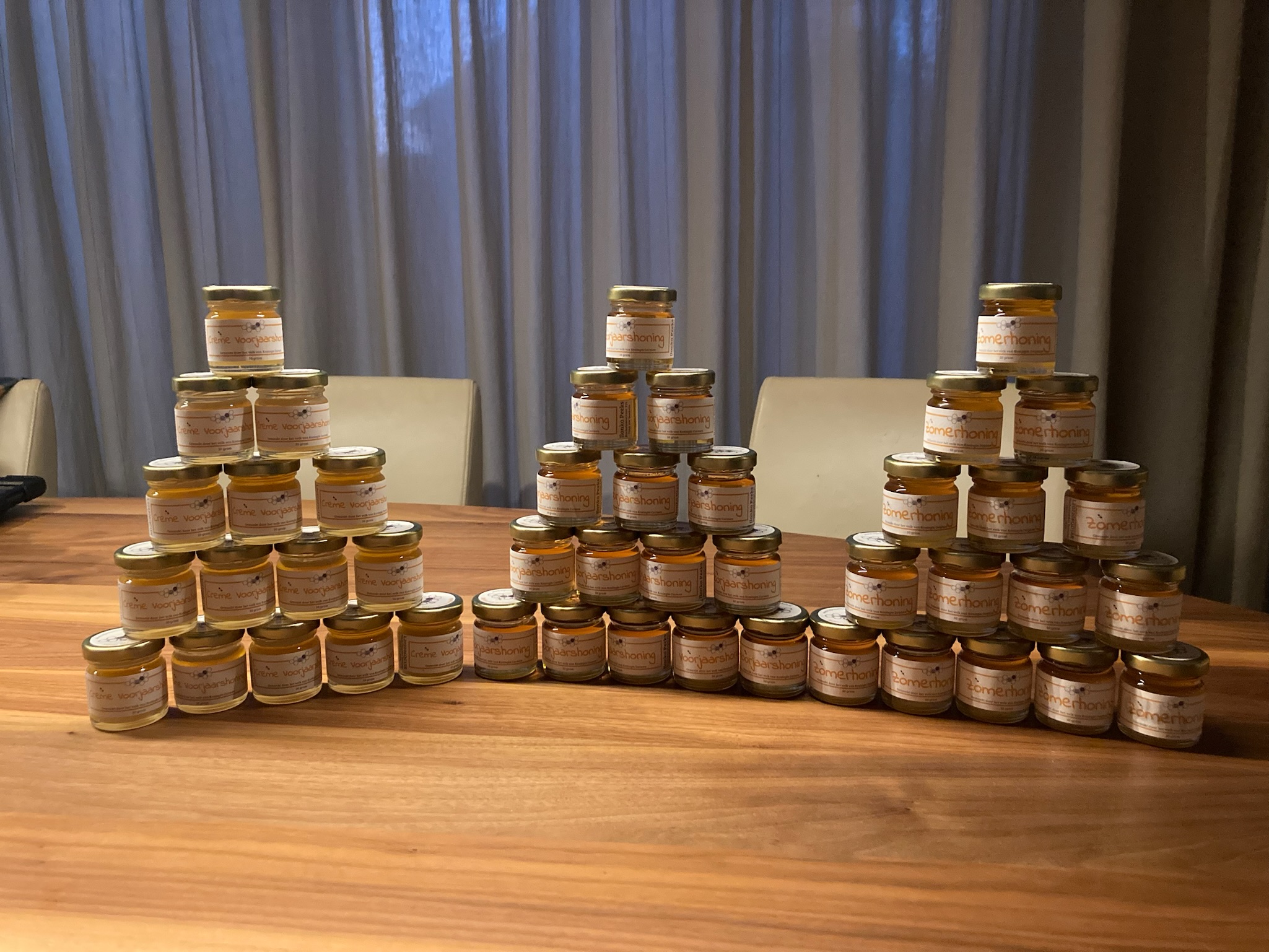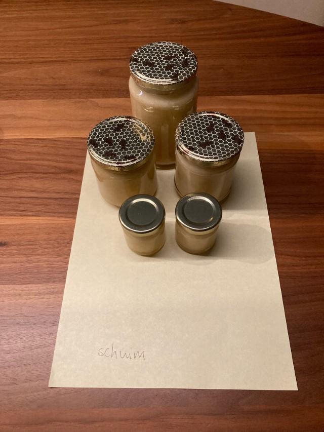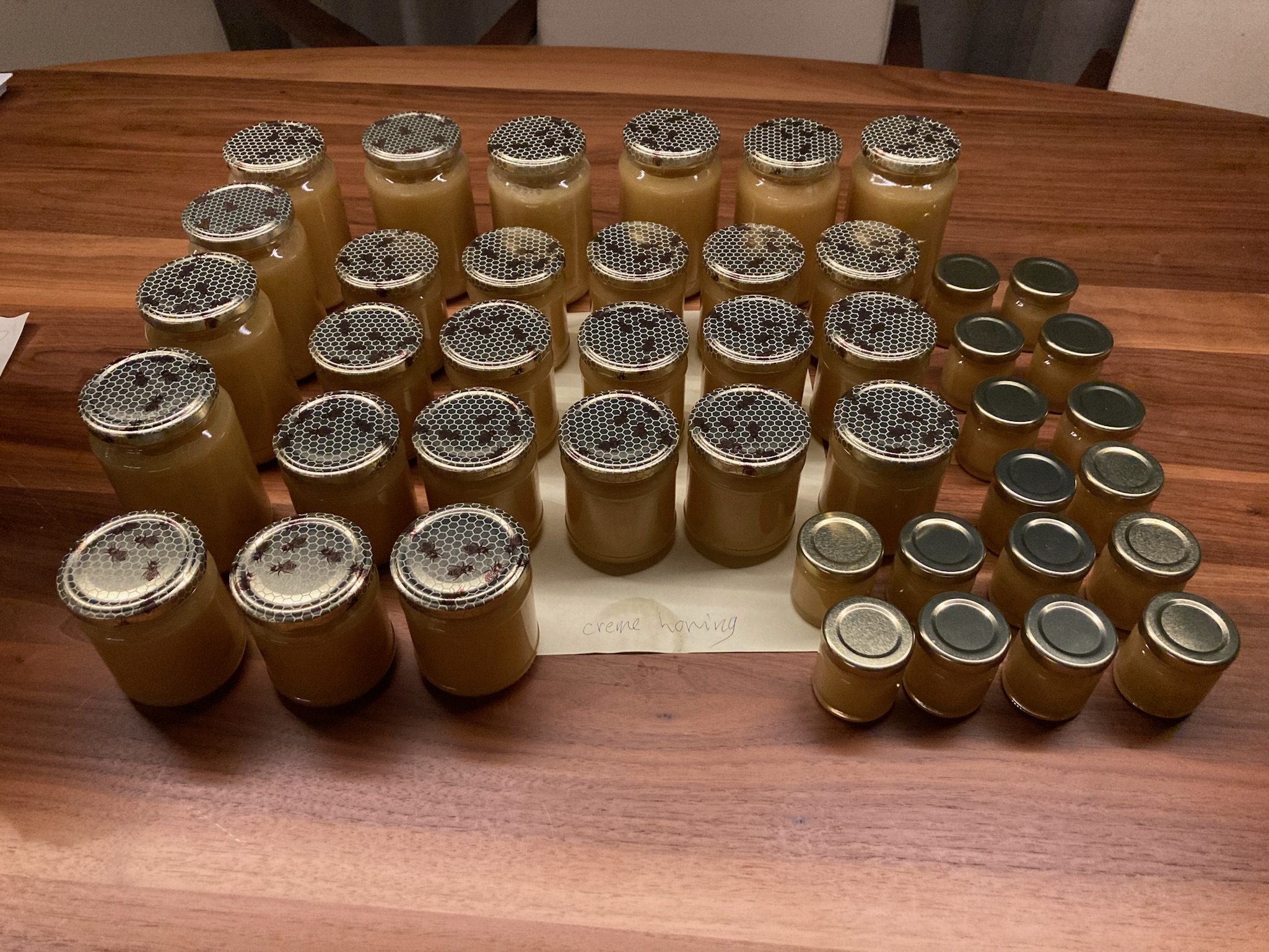 En zo gezegd, zo gedaan. 32 potten van 450 gram, 3 potten van 250 gram, en 16 potjes van 50 gram hebben we gevuld en voorzien van labels. Ook hebben we de kleine 50 grams potjes met cremehoning en gewone voorjaarshoning van vorig jaar voorzien van een label. De gehele voorraad staat nu dus klaar voor de verkoop.