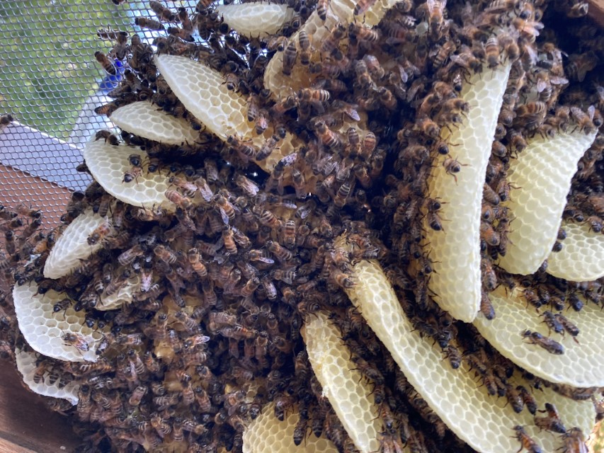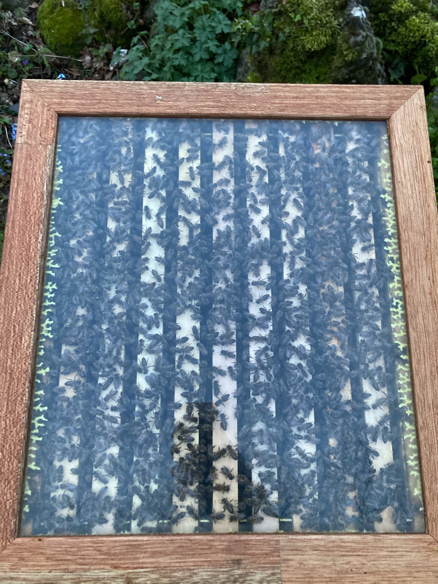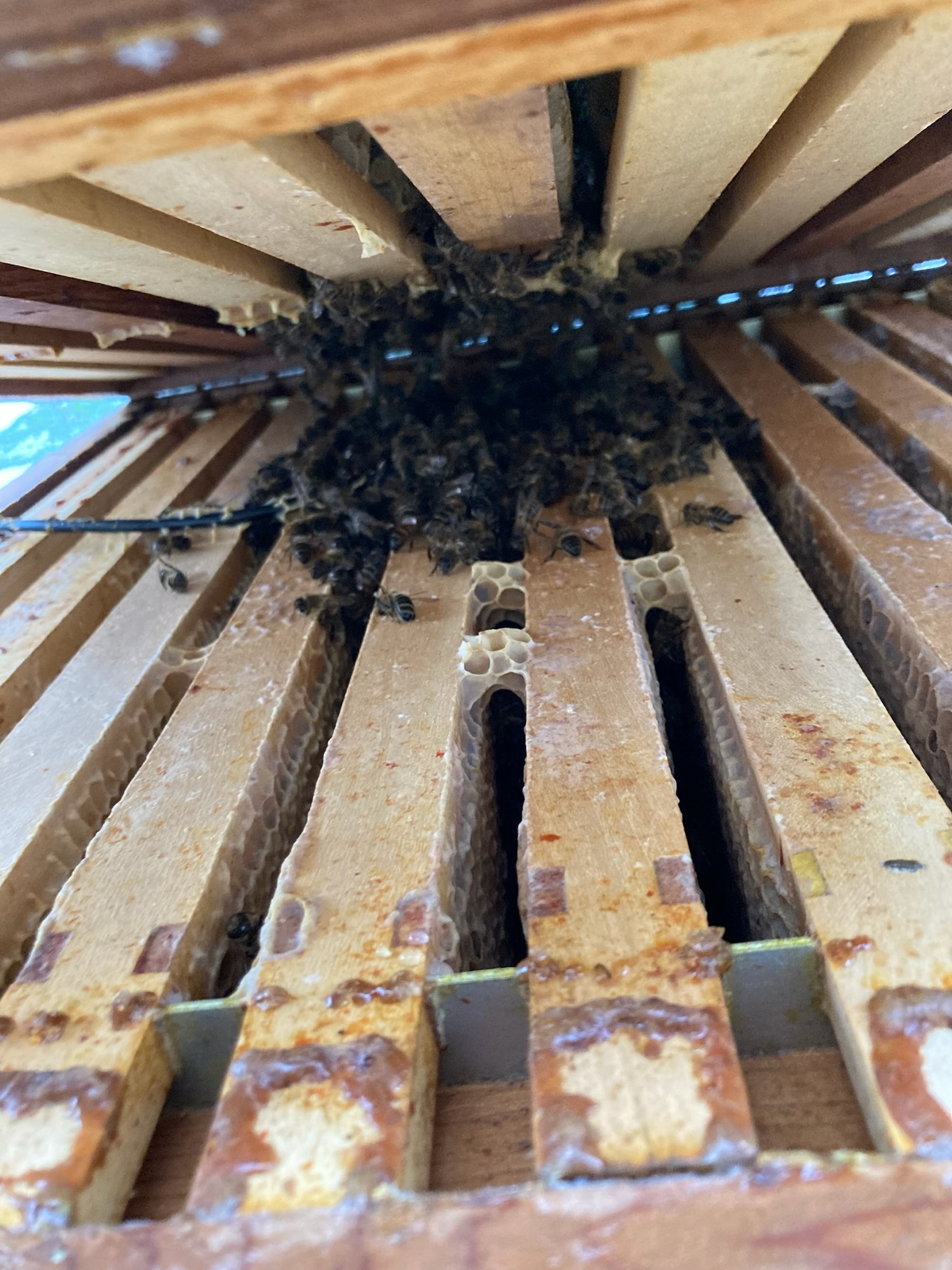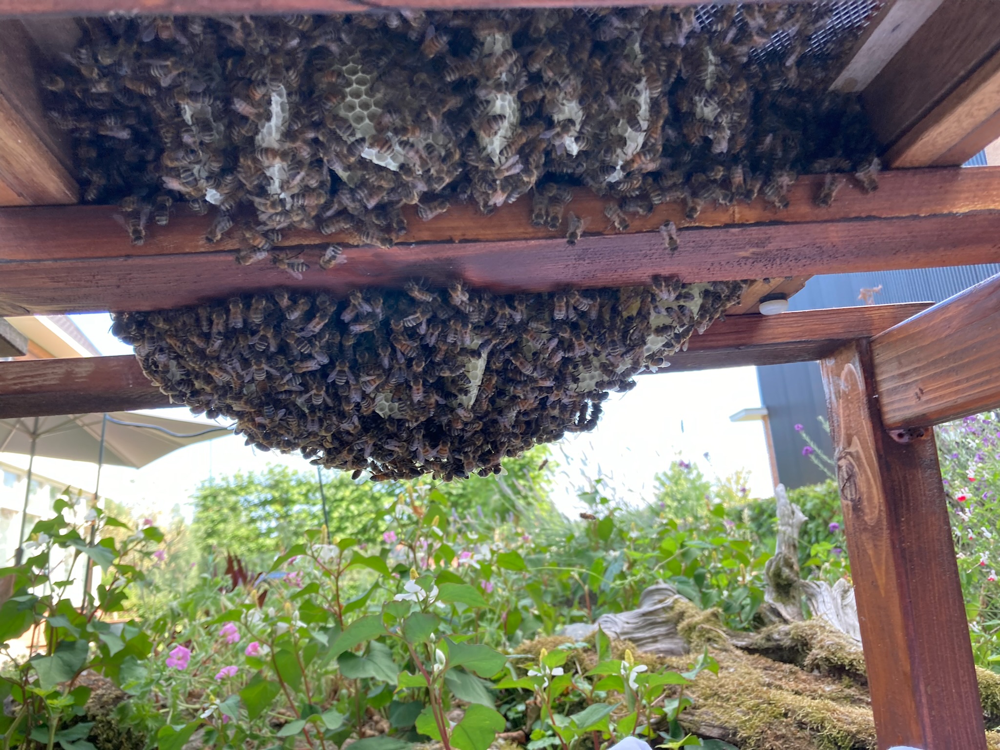 Bij het onder de kast turen naar de tros word het op een gegeven moment duidelijk dat ze raat bouwen. Dat is onhandig. En als het dan een dag goed weer is en veel krakers uitgevlogen zijn, wordt het duidelijk dat ze niet alleen raat hebben gebouwd, maar dat er ook een leggende koningin is. Er zit broed in de raat...