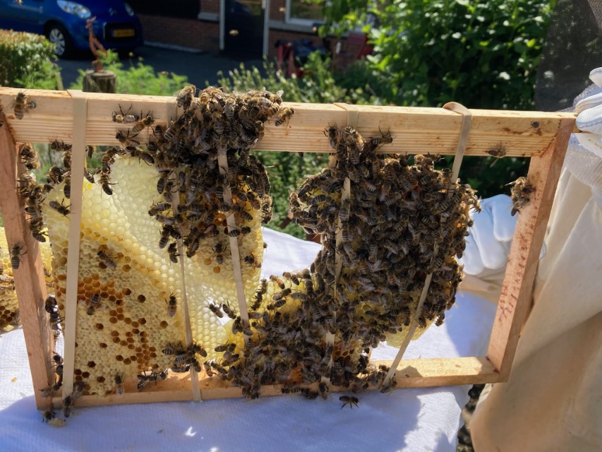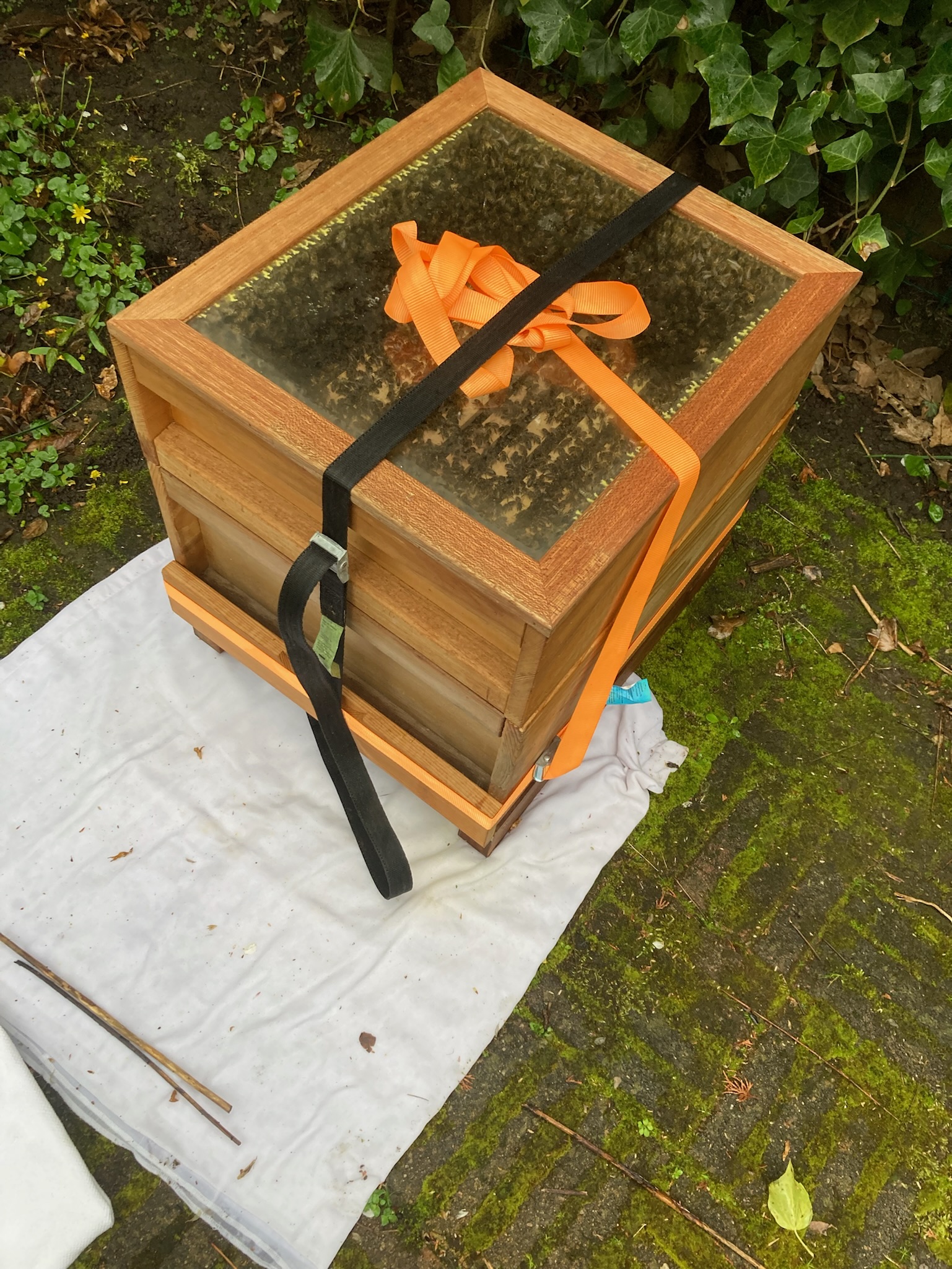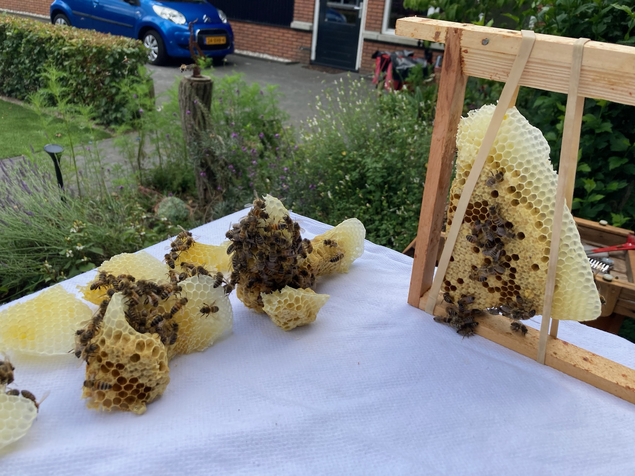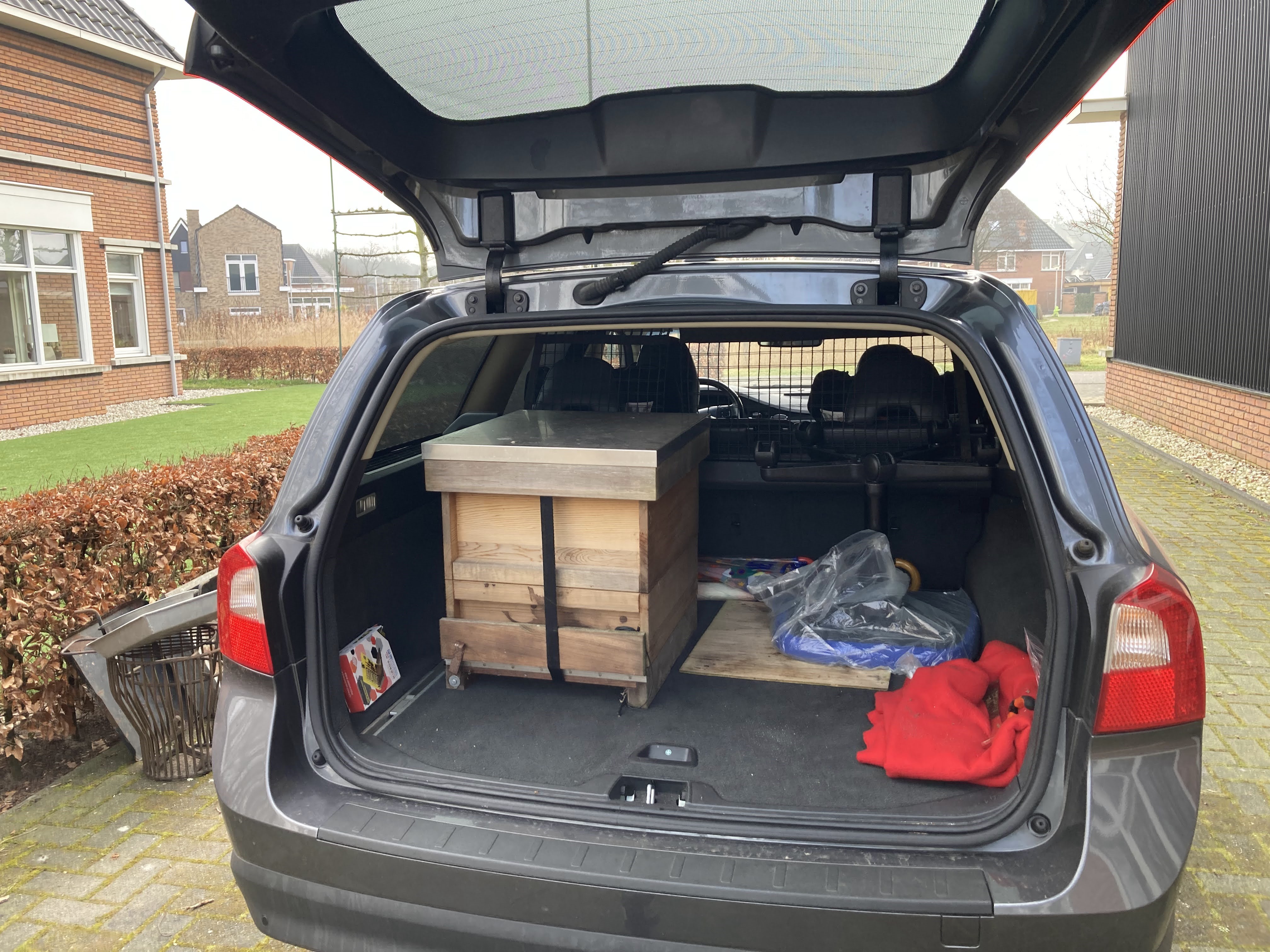 De kast is met een paar spanbanden snel klaargemaakt voor vervoer, en het is maar een kort ritje naar mijn bijenstand. Daar installeer ik de kast naast mijn andere volk, en is de verhuizing binnen Boekelo voor deze zwerm klaar! Aangezien het de komende week regenachtig en koud blijft, vervang ik een van de ramen kunstraat in de kast door een raam met voer. Zo kunnen de dames in alle rust zich de kast eigen maken. Het raam dat ik uit de kast haal, is al voor een deel uitgebouwd.