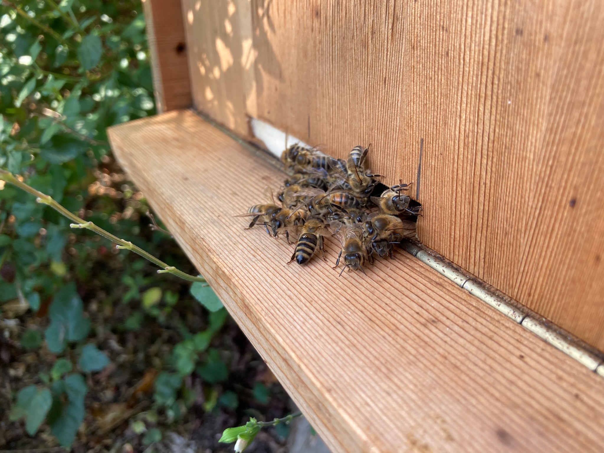 Ongeveer 72 uur na de verhuizing heb ik de vliegplank smorgens weer geopend, en in de loop van de ochtend kreeg ik bericht dat de bijen rond de kast aan het vliegen waren. Dat klonk goed!