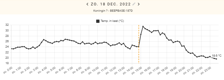 Gelukkig zie ik de dames wel vliegen, en kan ik middels de BEEP base zien dat de tempratuur in de 30 graden zit. Er is dus broed, dat is goed. Door de glazen dekplank kan ik ook zien dat de bijen (weer) in de bovenste broedkamer zitten. De activiteit is goed dus!