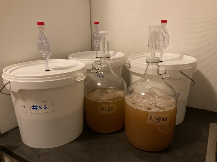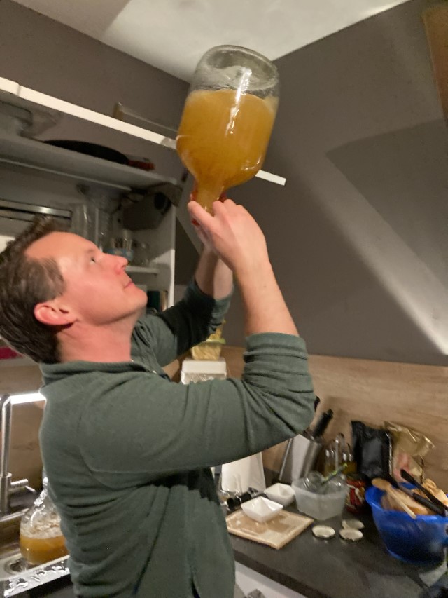 De mede die we eerder dit jaar hebben gemaakt, hebben we helaas aan de gootsteen toevertrouwd. Beide gistingsflessen stonden al een tijd op het aanrecht in de bijkeuken, te wachten op ons oordeel van de inhoud. Die viel ongunstig uit, zowel de mede op waterbasis als de cyser op basis van appelsap smaakten dusdanig slecht dat we ze weggedaan hebben. Wellicht volgend jaar een nieuwe poging!