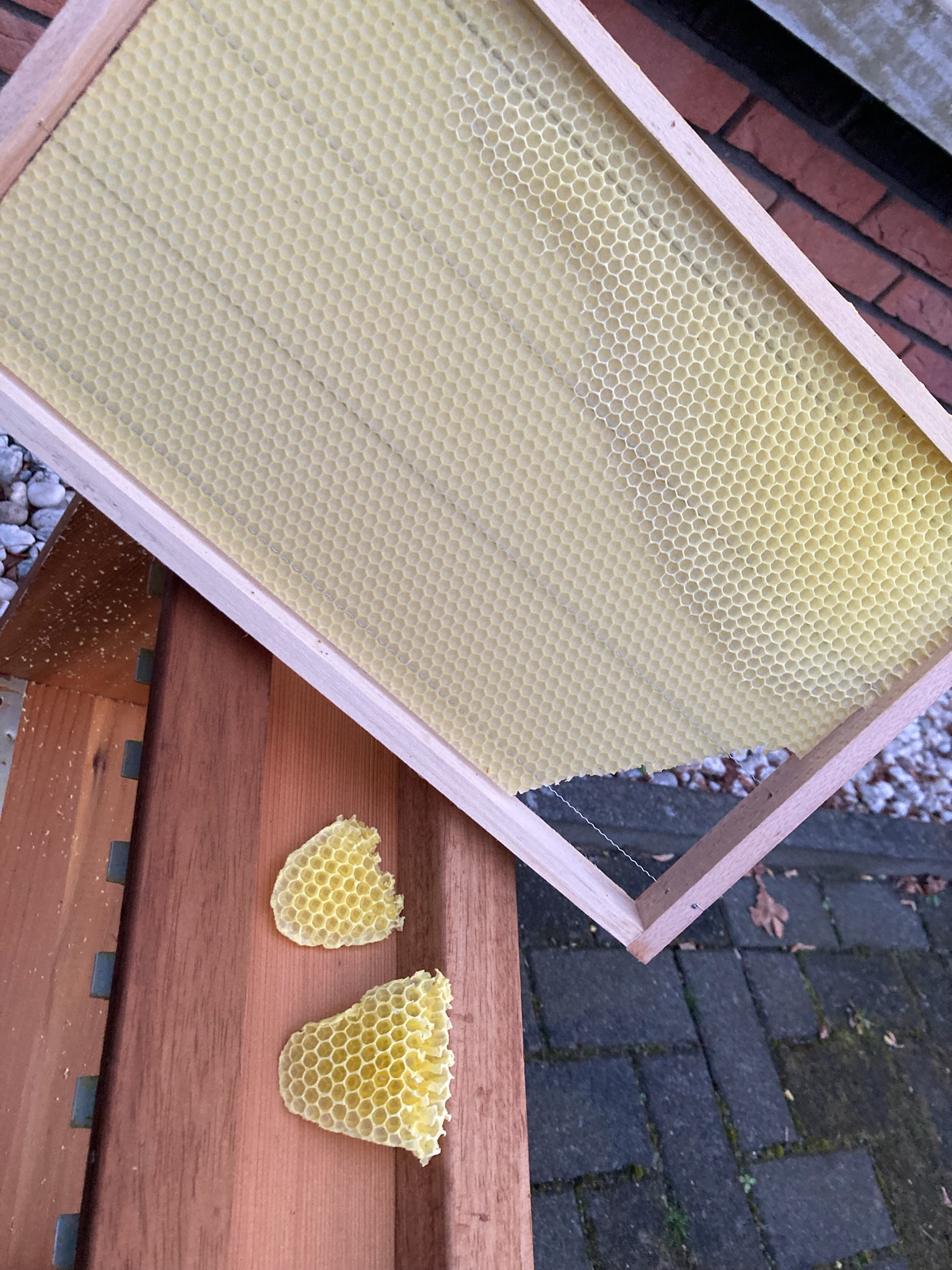 Bij de voorjaarscontrole wil ik ook eventuele ramen met overtollig wintervoer uit de kast halen en vervangen door ramen met kunstraat. Aangezien ik dit jaar over wil op een celmaat van 5,1mm, in plaats van de Nederlandse standaard 5,4mm, moest ik weer een avond bezig met het insmelten van kunstraat.