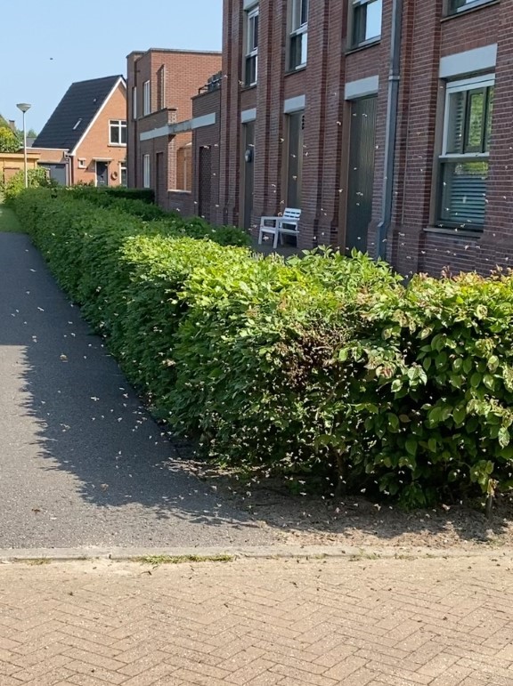 Helaas was het een paar dagen later wederom raak, net toen ik een paar dagen weg was. Deze keer hing de zwerm in de haag aan de overkant van de weg, naast het voetpad langs de beek. Goed bereikbaar, maar gezien het aantal mensen dat hier dagelijks langs komt een heel stuk minder praktisch. Gelukkig werden er door het thuisfront voorzorgsmaatregelen getroffen, en kon 's avonds mijn uitstekende supportteam ook deze zwerm scheppen.