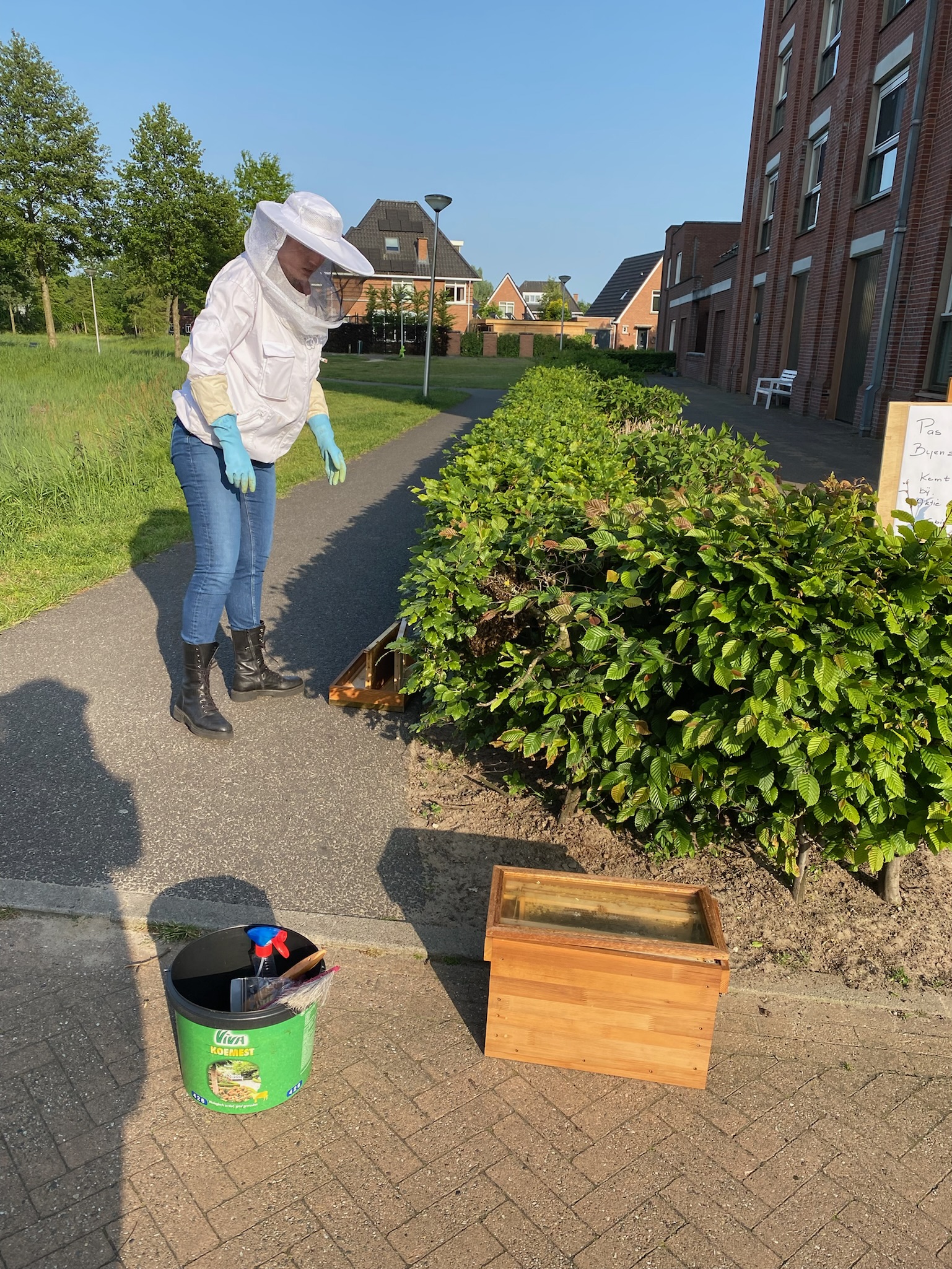 Een uurtje later was ik weer ter plaatse, gewapend met hulp-imker, emmer, lap vitrage, vegers, een kast, en uiteraard pak en handschoenen.