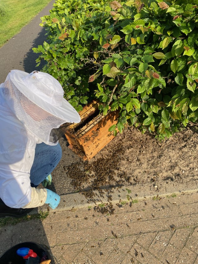 Aangezien de verhuizing eerder dit jaar voornamelijk bijen waren, en weinig spullen, moest ik eerst een kast en voldoende ramen bij elkaar sprokkelen om de zwerm te kunnen huisvesten. De opslaglocaties liggen gelukkig niet ver uit elkaar, dus ik kon snel aan de slag. Gewapend met bak en veger was de zwerm snel geschept en in de klaargezette kast geplaatst. Het geheel is vastgelegd door het kleinste lid van het hulpteam, die helaas gestoken werd tijdens zijn verslag. Extra sneu omdat ik net had verteld dat bijen in een zwerm eigenlijk nooit zomaar steken!