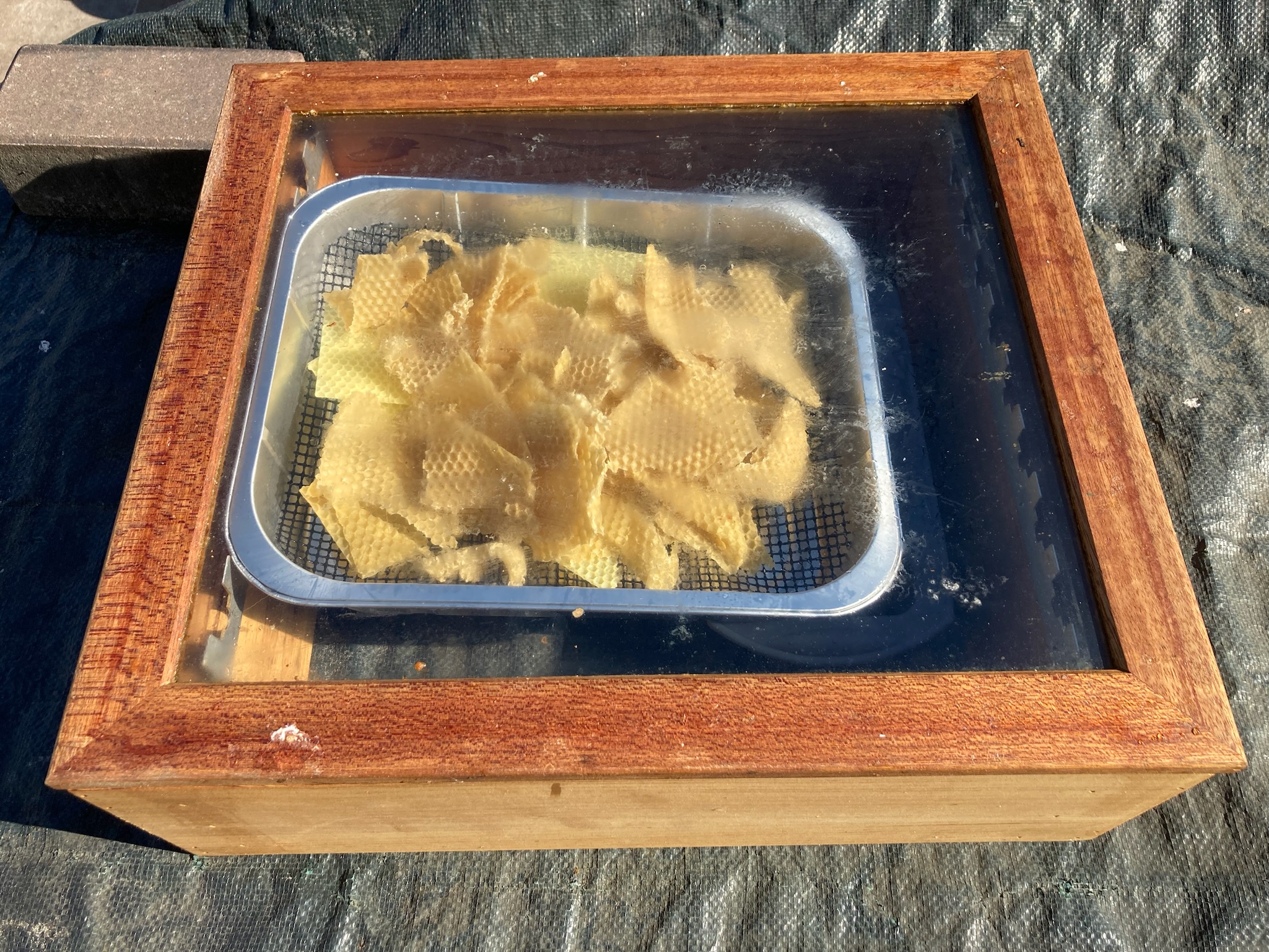 Zo ontstond de wens voor een zonnewassmelter, maar dan wel een die de was voldoende goed kon filteren zodat ik niet daarna ook nog aan de gang moest met pannen heet water, filterdoekjes en dekens. Nadat ik een aantal website had bekeken van mensen die zelf een smelter hadden gemaakt, ben ik met wat kastonderdelen die ik had liggen aan de slag gegaan. Een broedkamer, een houten dekplank, en een glazen dekplank vormden de basis. Een aluminium grillbakje, wat filtermateriaal, en een siliconen cakeblik ronden het af, en zo kon ik op zonnige dagen allerhande restjes was smelten tot prachtig gele, heerlijk ruikende wasstaven.