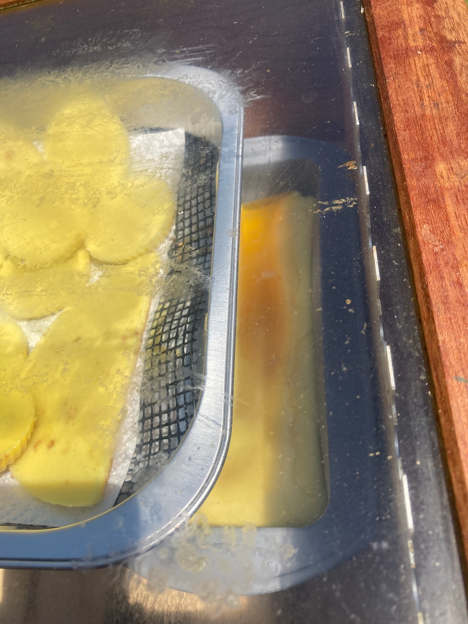 Het plan om gehele raampjes te smelten liep minder goed: de smelter sloot niet helemaal, waardoor de waslucht die vrij kwam bijen aantrok. Ondanks dat ik dacht de smelter met plastic goed afgesloten te hebben, vonden deze bijen een weg naar binnen. Een route uit die heteluchtoven konden ze helaas niet vinden, en zo trof ik 'savonds een slagveld met dode bijen aan...