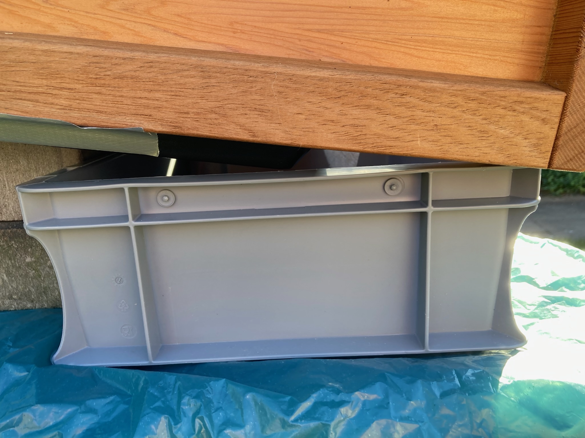 Deze keer liep het helaas anders. Bij beide kasten heb ik de bijenuitlaat zonder goed te checken in de dekplank gelegd. Bij de kast van Koningin Delphine zijn daarmee de gaatjes waardoor de bijen er weer uit kunnen boven een raampje van de kamer er onder terecht gekomen. De bijen konden er daardoor niet uit.