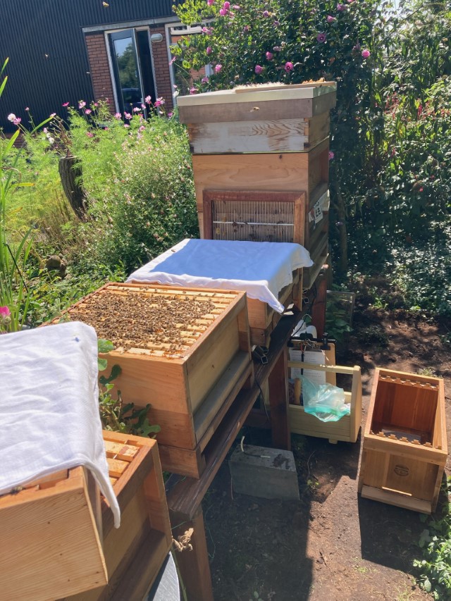 De overige ramen probeer ik alle moercellen en speeldopjes te vinden en weg te breken. Die gaan daarna terug in de originele kast, en worden wederom aangevuld met kunstraat. Beide kasten krijgen een van de honingkamers die op de originele kast stond, zodat de volken wat voorraad hebben. Koningin Elodie laat ik weer los in de originele kast. Laatste stap is het opschuiven van de kast van Koningin Elodie, en het plaatsen van de nieuwe kast op de oude plek.