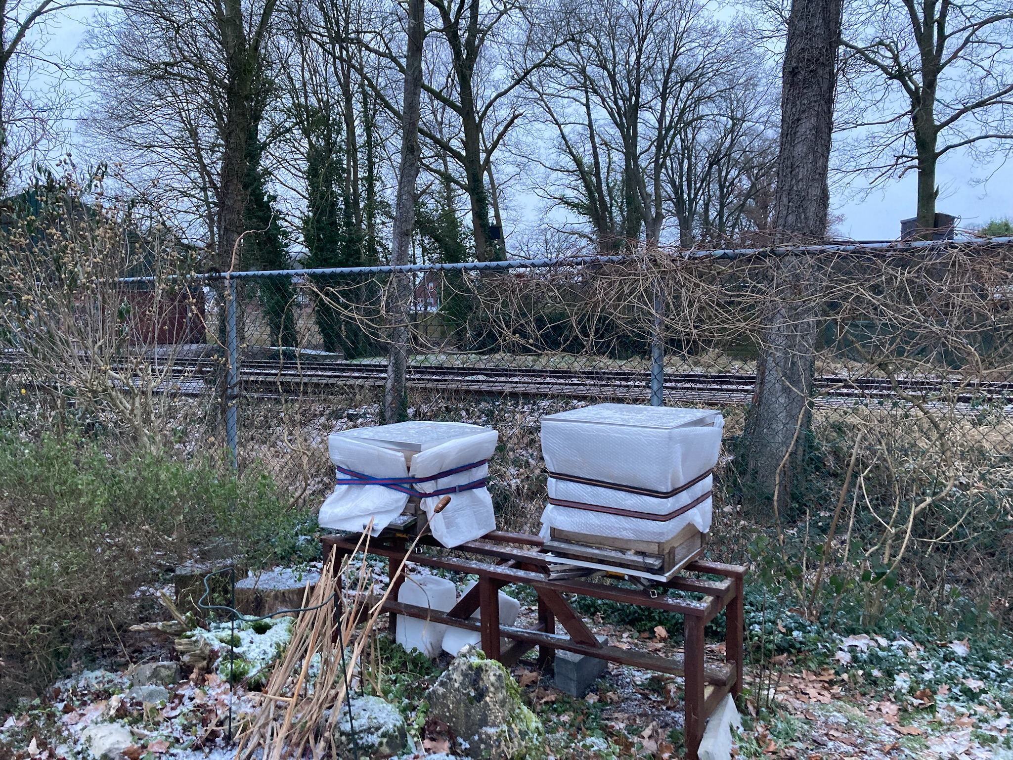 Aangezien de temperatuur toch een heikel punt blijft in de winter, heb ik besloten om de kasten verder te isoleren. Een segeberger, met zijn dikkere styropoor wanden, is voor de bijen makkelijker warm te houden in de winter dan de enkelwandige houten spaarkast. Daarom heb ik met het hulpteam belletjesplastic om de kasten gewikkeld in de hoop dat het wat makkelijker voor ze is warm te blijven met dit weer.