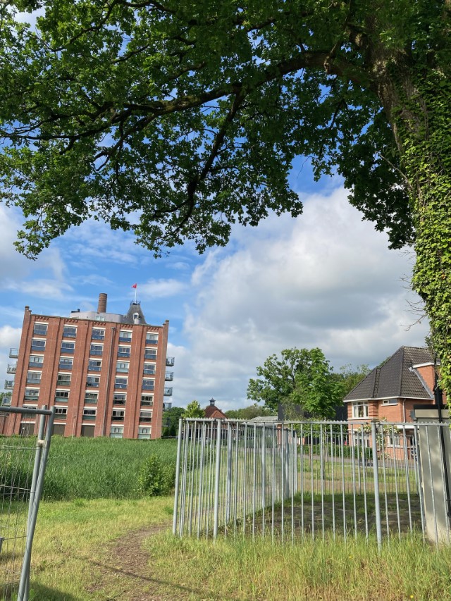 Deze plek was, op zich, een heel stuk beter. De zwerm hing in 1 tros aan de onderste tak. Nadeel was dat deze tak zich op zo'n 10 meter hoogte bevond. Ook de lange ladder zou deze plek niet veilig kunnen bereiken. Maar het toeval wil dat de lokale brandweerkazerne om de hoek zit, dus onder het motto "wie niet waagt, wie niet wint" ben ik daar gaan informeren of ze me misschien konden helpen.