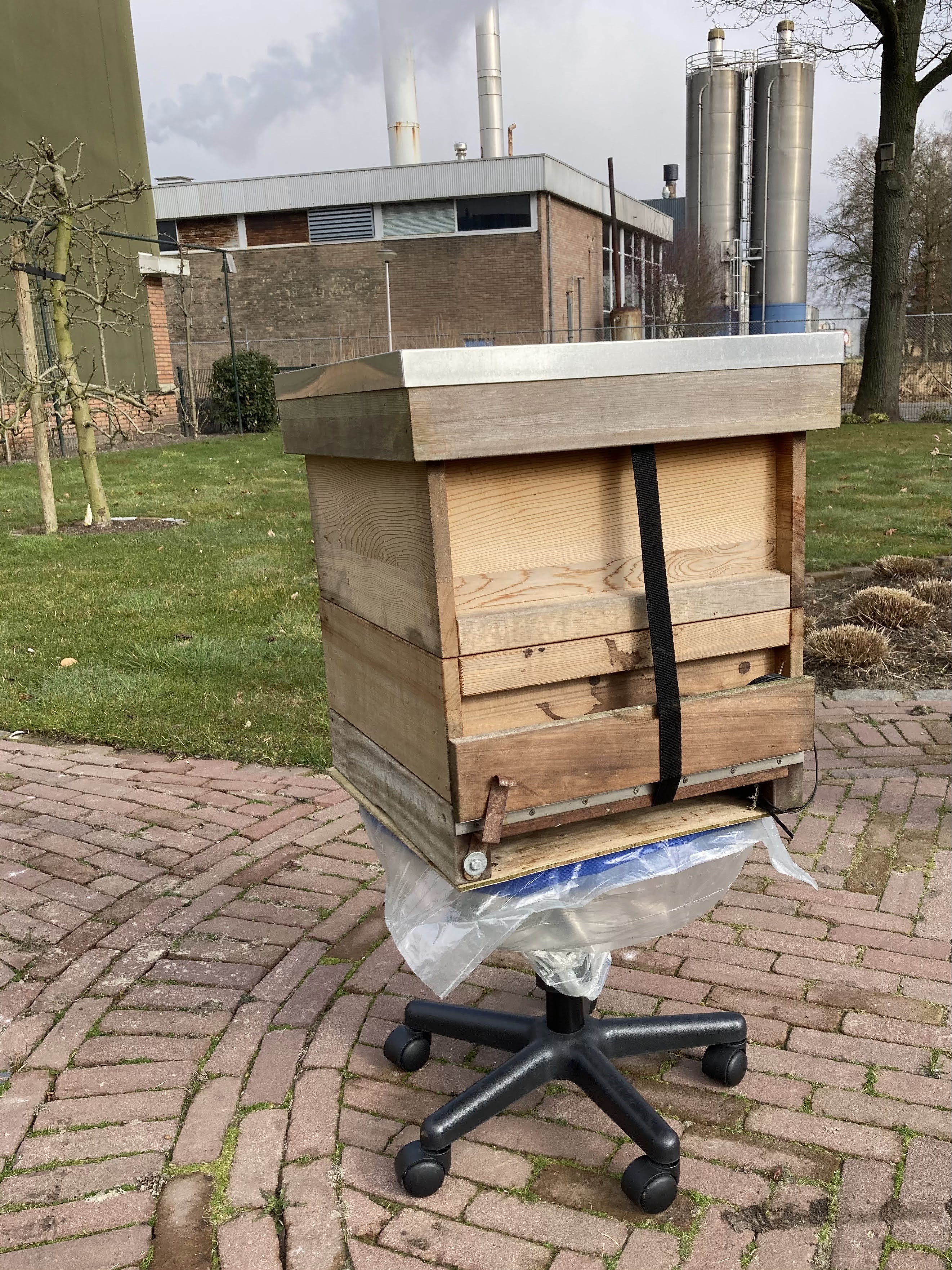 En zo arriveerde ik op een vrije ochtend gewapend met spanband, bureaustoel, en de nodige zorgen bij de bijen.
