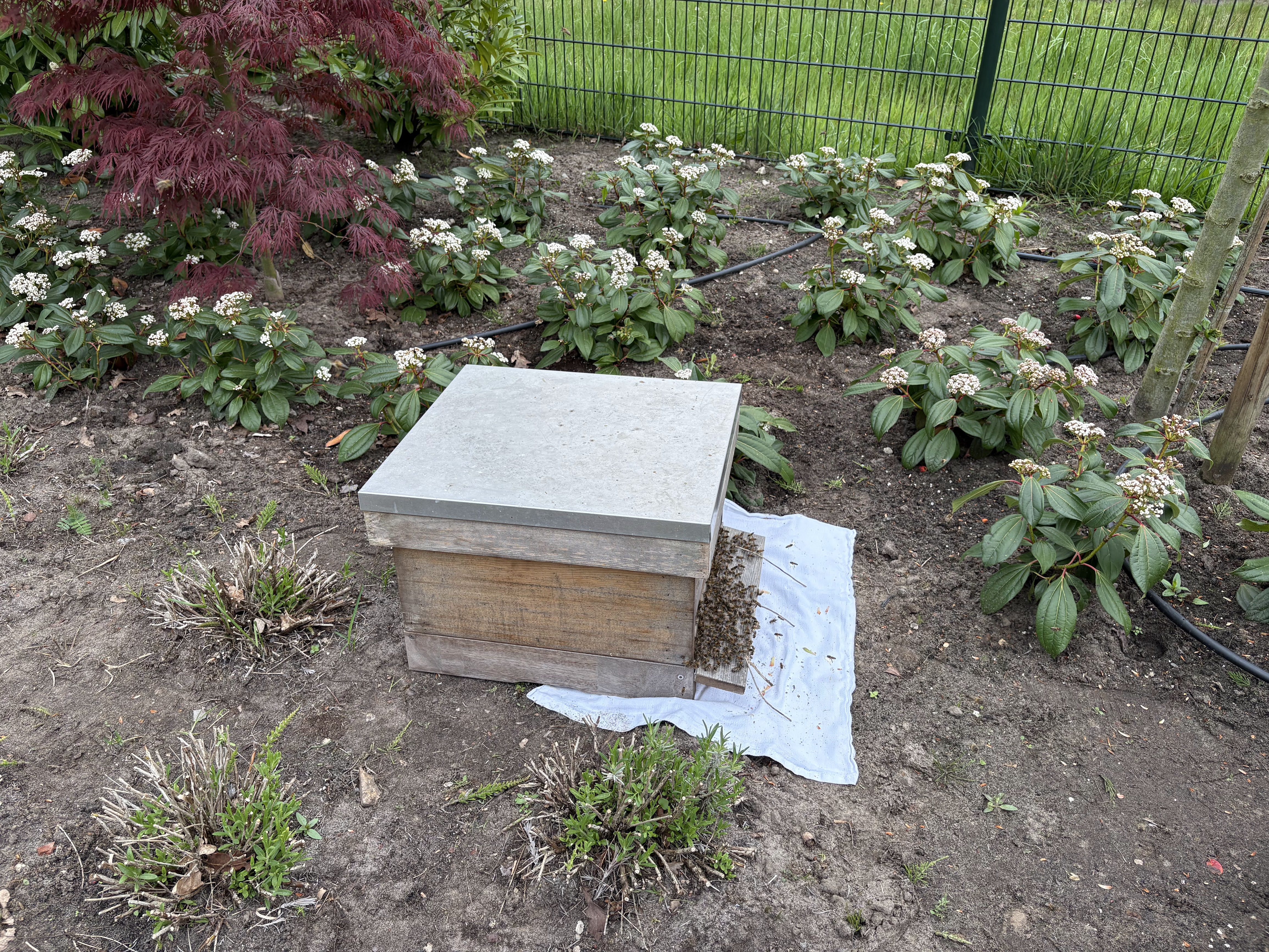 Normaal gesproken laat je een geschepte zwerm een tijdje staan, en haal je een geschepte zwerm aan het einde van de middag of het begin van de avond op. Zo hebben alle bijen die nog rondvlogen ruim de tijd om zich bij het volk te voegen. Op de avond van het zwerm scheppen was ik echter verhinderd, dus ik haal de zwerm de volgende ochtend vroeg op, voordat ze tijd hebben om uit te vliegen. Het helpt in dit geval dat het kil regenachtig weer is, en de bijen lekker binnen zitten.
